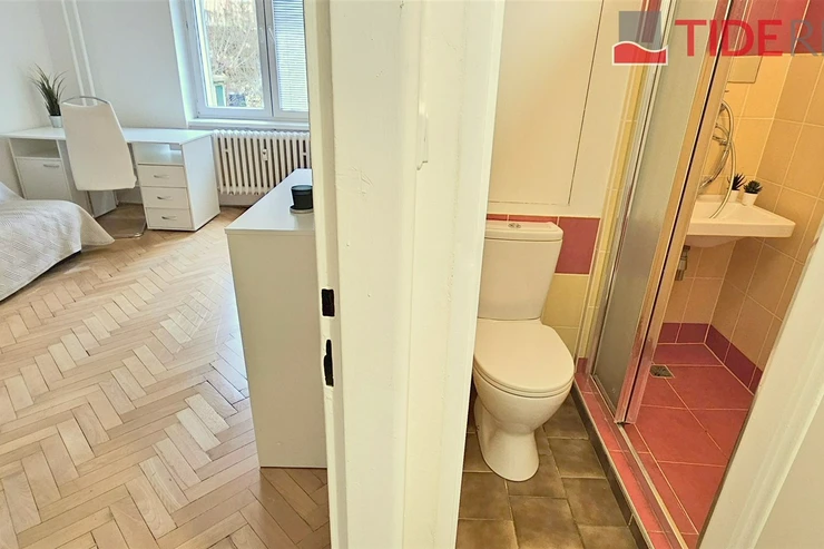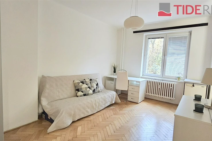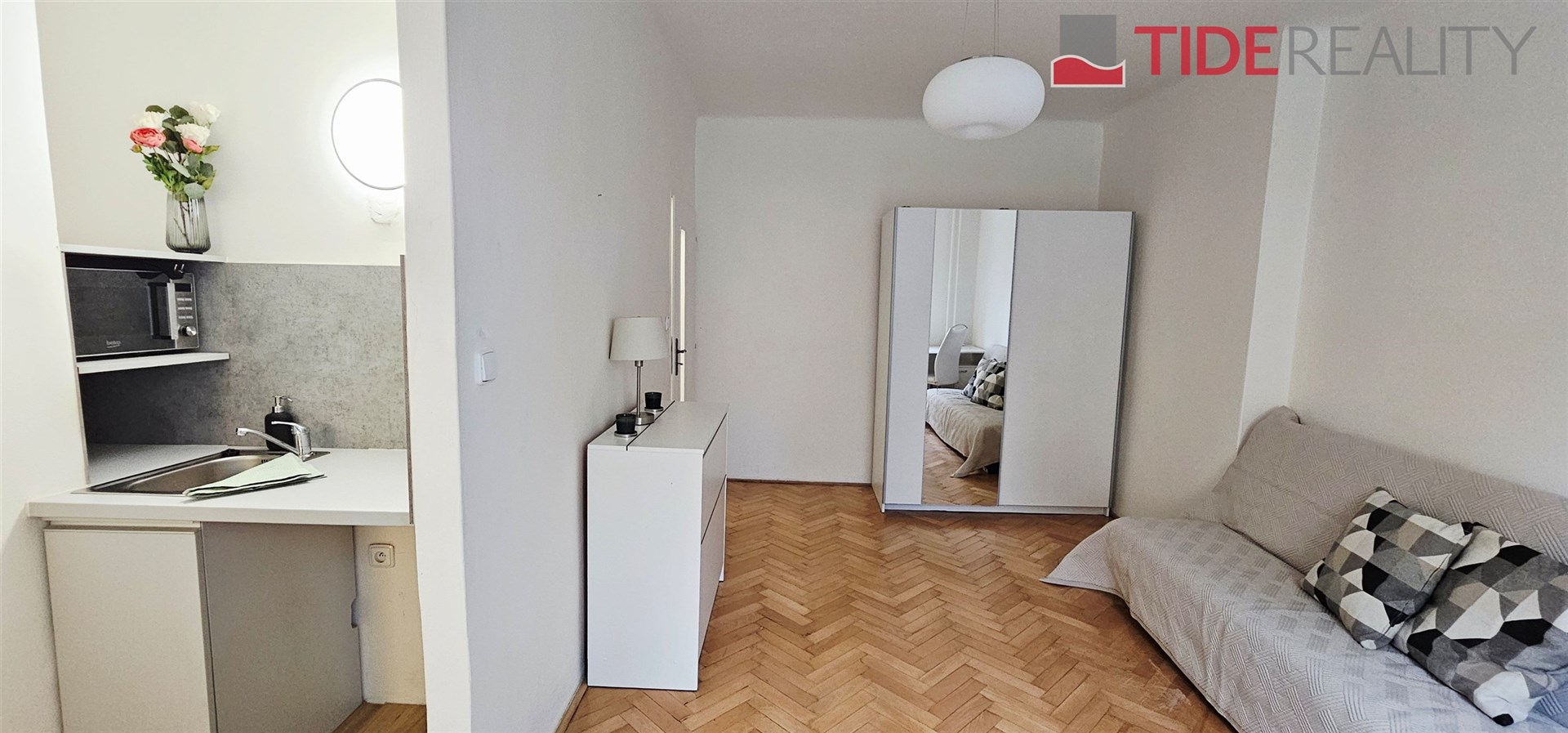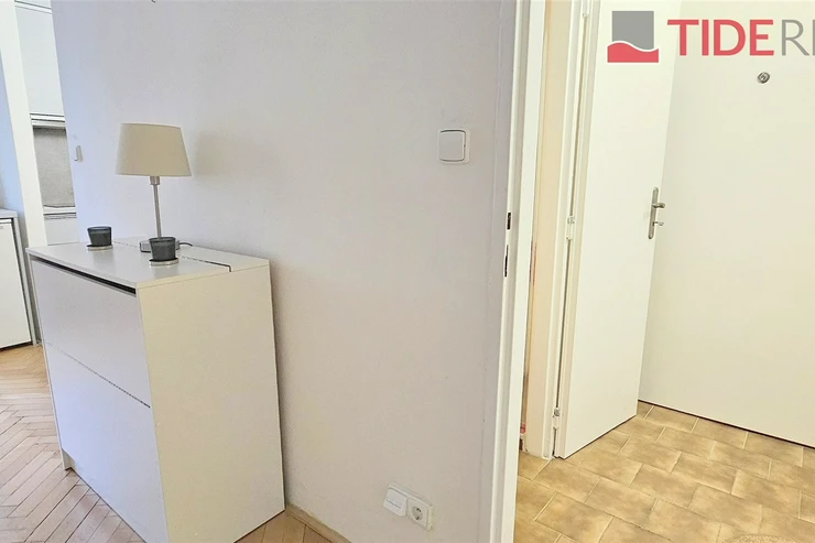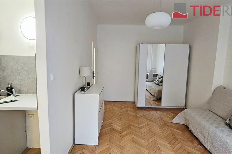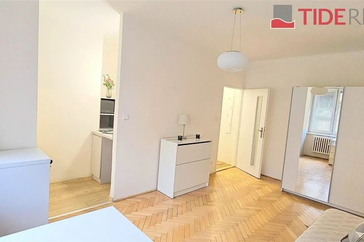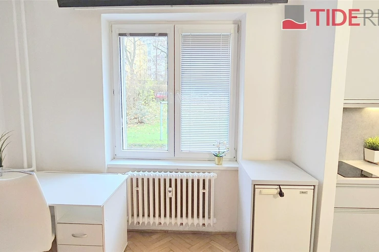 In exclusive representation of the owner, we offer for sale a 1+kk apartment with a total area of 24 m2, located on the elevated ground floor of a very well-managed building. The apartment faces south towards a closed courtyard, making it very quiet, bright, and secure. Both the house and the apartment are in excellent technical condition, following a renovation (insulated, plastic windows with both internal and external blinds, parquet flooring, new kitchen unit, new wiring). The apartment includes a cellar cubicle. Parking is hassle-free in a designated residential area.