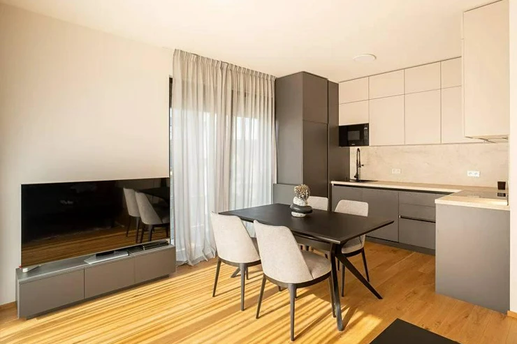Plně zařízený byt 3+kk o velikosti 80,4 m je vybaven kvalitním nábytkem a spotřebiči značky Miele a je připraven k okamžitému nastěhování.