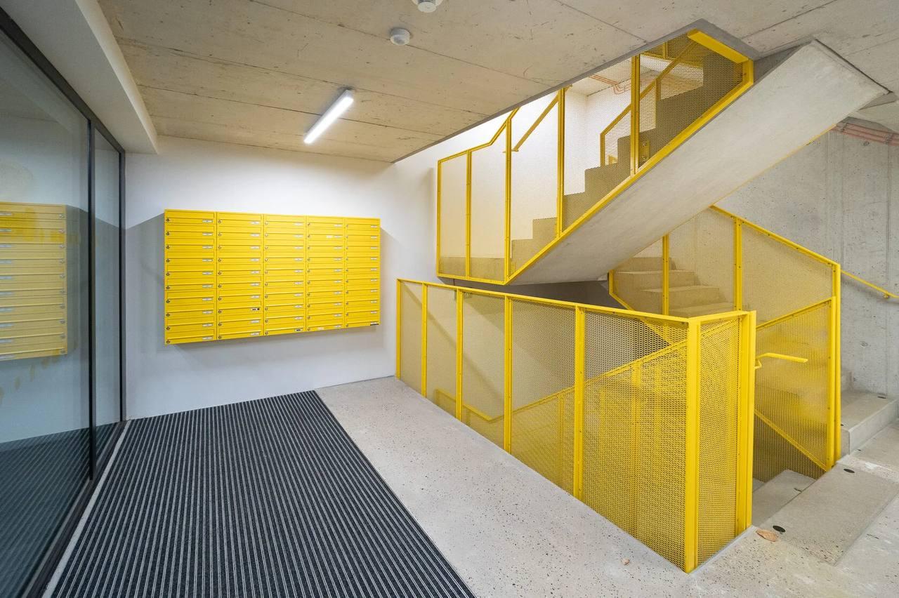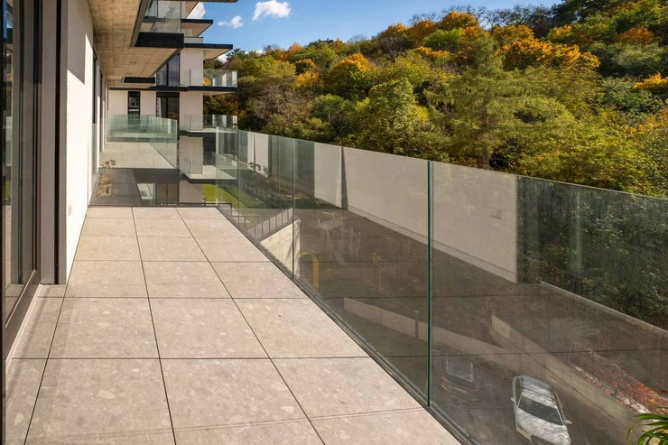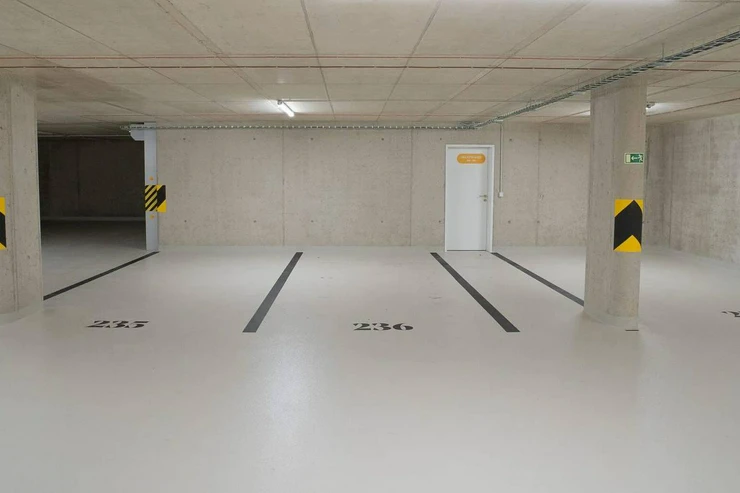 Dispozice zahrnuje prostorný obývací pokoj s kuchyňským koutem, dvě ložnice, koupelnu a samostatné WC. K bytu patří také dva balkony (9,9 m a 9 m), sklep (1,9 m) a parkovací stání v podzemí, které jsou již zahrnuty v ceně.