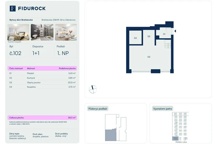 We are pleased to offer for sale a beautiful and bright 1+kk apartment with a total area of 35.70 m², located on the 1st floor of a renovated residential building at Bratislavská Street 59, Brno–centre.