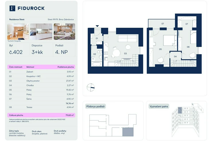 We are pleased to offer for sale a beautiful and bright duplex apartment (3+kk) with a total area of 78.2 m², featuring a terrace, located on the 4th floor of a renovated residential building on Stará Street 19, right in the heart of Brno.