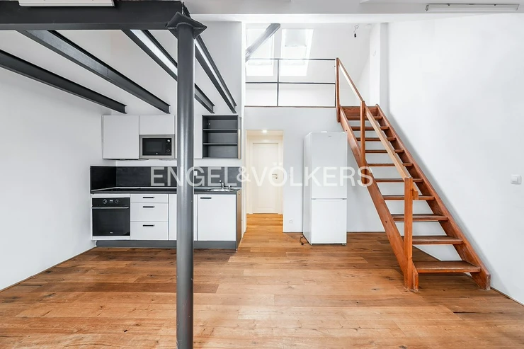 The apartment has a practical and fully separate layout. The living room with a kitchenette forms an open and airy space with a beautiful view towards Kaizlovy Sady. In the upper part of the living area, there is a gallery that can be used as storage space or a reading corner.