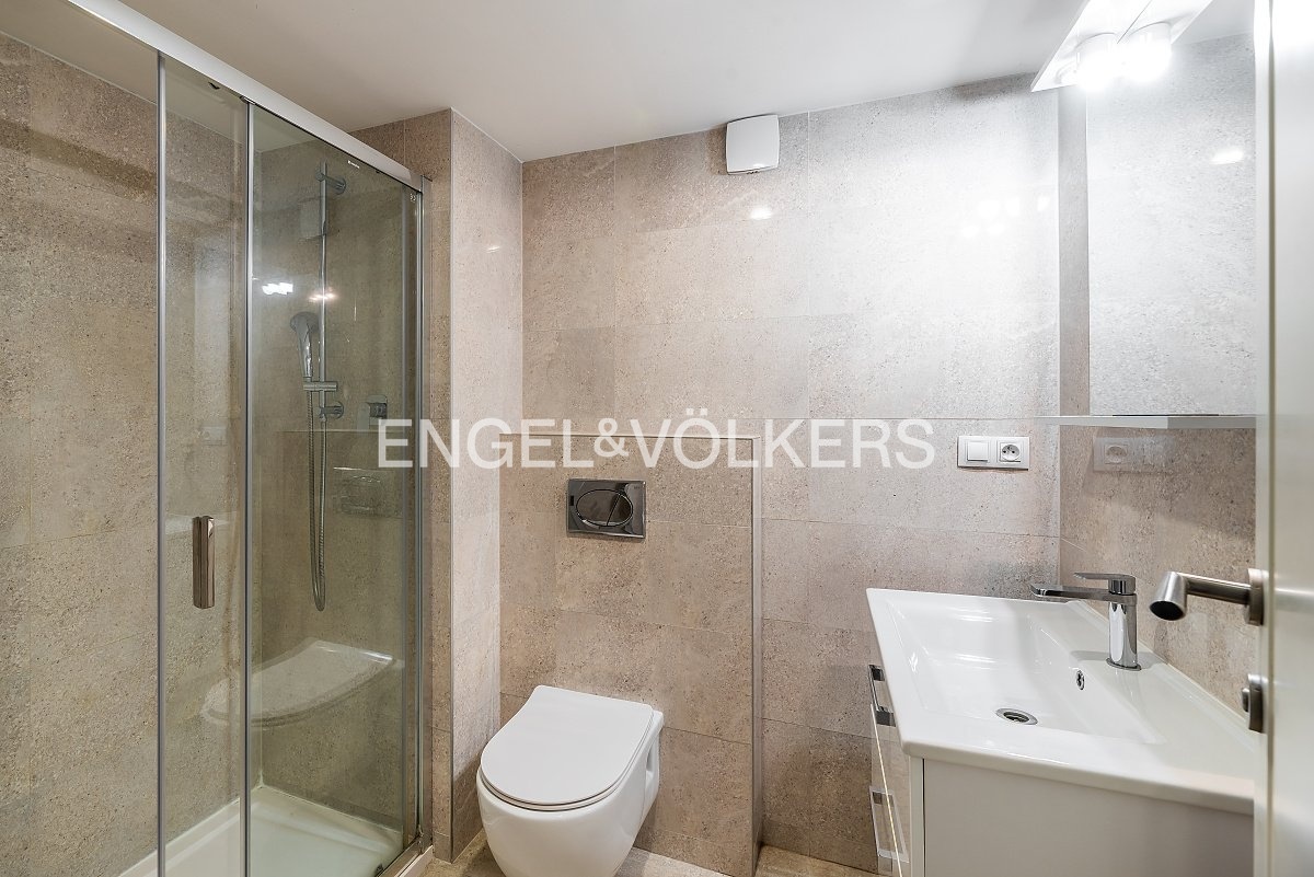 The bedroom faces a quiet courtyard, has no sloping ceilings, and also has a walk-in closet. The bathroom is separate from the toilet, which contributes to greater comfort in everyday use.