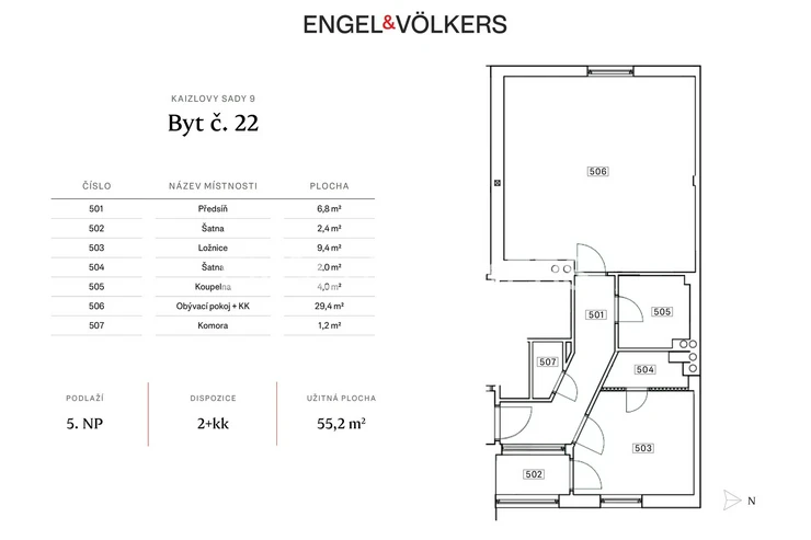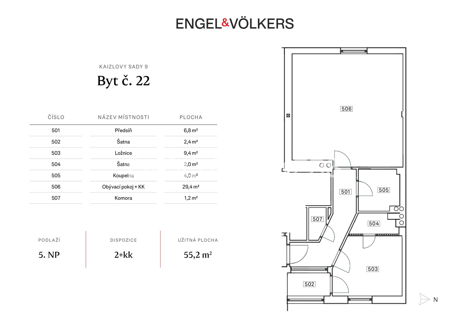This 55.2 sqm 2+kt apartment is located in an attic conversion from 2020, situated on the top floor of a well-maintained apartment building with a lift. Thanks to its southern orientation towards the quiet Petra Slezáka Street, the entire space is pleasantly lit throughout the day and offers peace and privacy.
