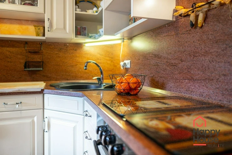 The kitchen features all necessary appliances, including a built-in fridge with freezer, ceramic hob, electric oven and extractor fan. The apartment has laminate flooring in the living areas and ceramic tiles in the hallway, bathroom and toilet. The entrance door is security-rated. Heating is central (district heating) and the building’s energy rating is class C.