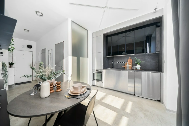 2. Dining room: It has an elegant kitchenette with built-in appliances incl. a washing machine and dishwasher. There is also space for a dining table for 3 people. And there is a shelving wall where you can store or hang anything you need to put aside.
