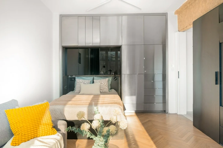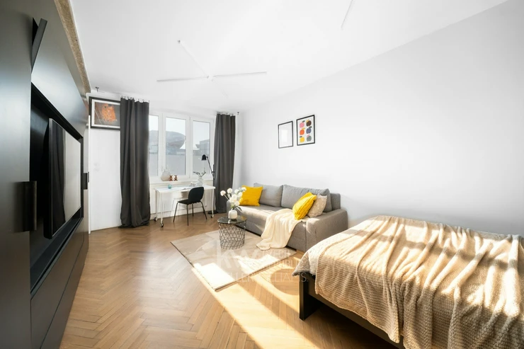 1. Living & sleeping room: The living area of this room accommodates a large convertible sofa and a TV wall. The sleeping area fits a double bed and built-in wardrobes where you can store all your clothes. And the workspace in this room by the window features a large working desk. The desk is illuminated by daylight and inspires you with a beautiful view directly of the airship of the DOX Centre for Contemporary Art.