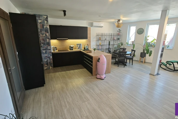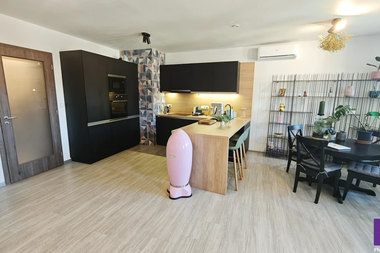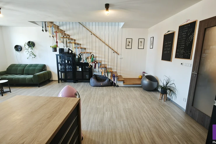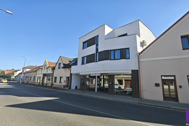 Sale of apartment 2+kk, 87 m²/PS, OV, Poděbrady. This duplex, energy-efficient, air-conditioned apartment with two bathrooms, a covered parking space, and a cellar was approved in 2019 and is located in the heart of the spa town of Poděbrady. The apartment is part of the second and third floors of a brick building with an elevator, and the property is accessible barrier-free, only through a remote-controlled gate for car access or a pedestrian gate. The building comprises four residential units and one non-residential unit.