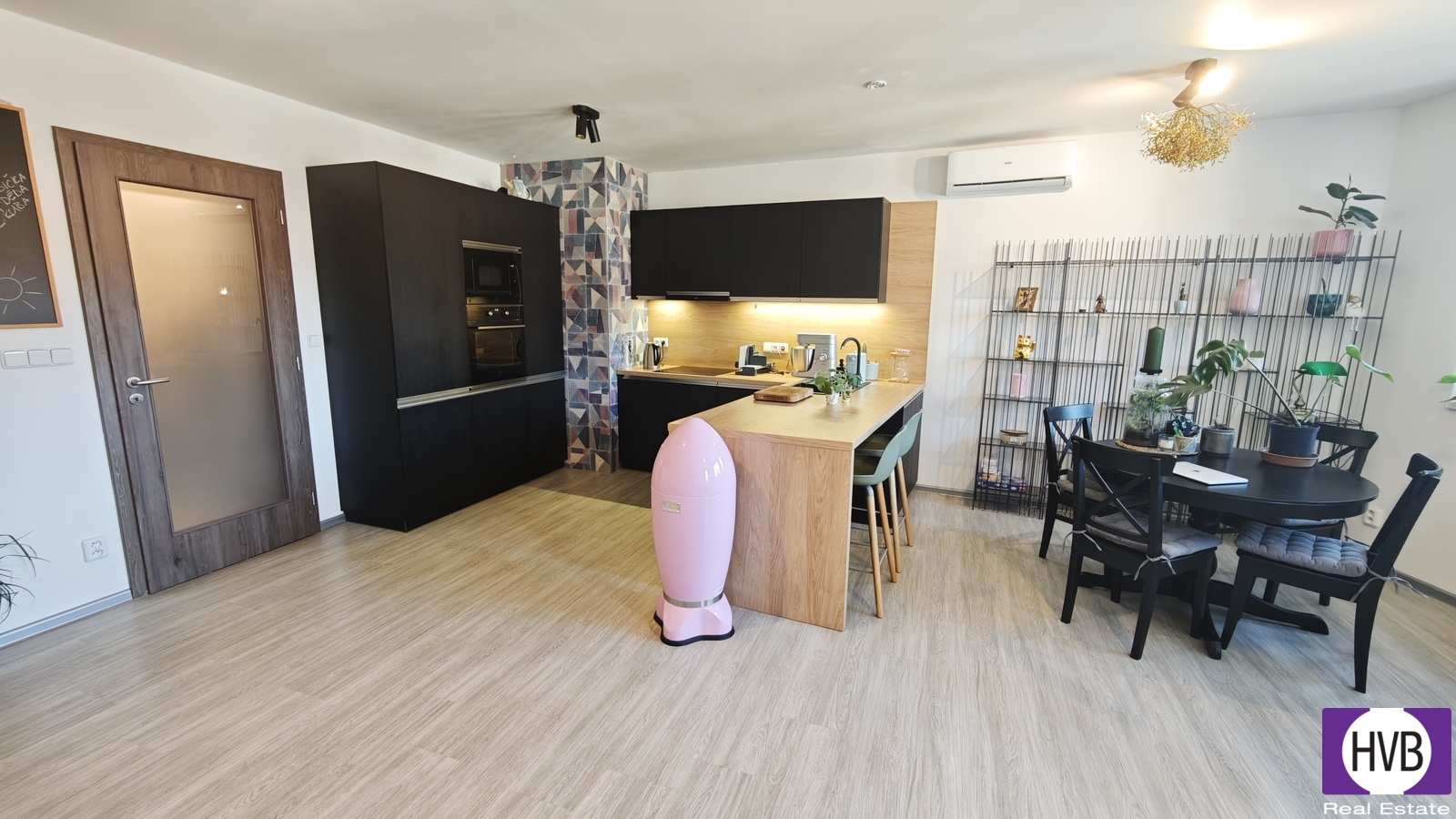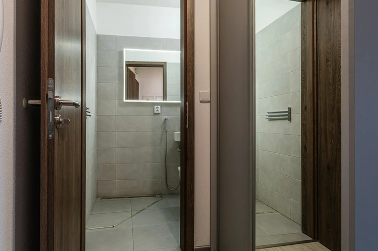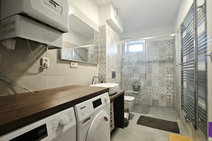 The entire apartment is equipped with underfloor heating, with vinyl flooring in the living areas and tiles in the bathrooms and toilet; the bedroom has outdoor blinds to ensure pleasant climate and privacy.