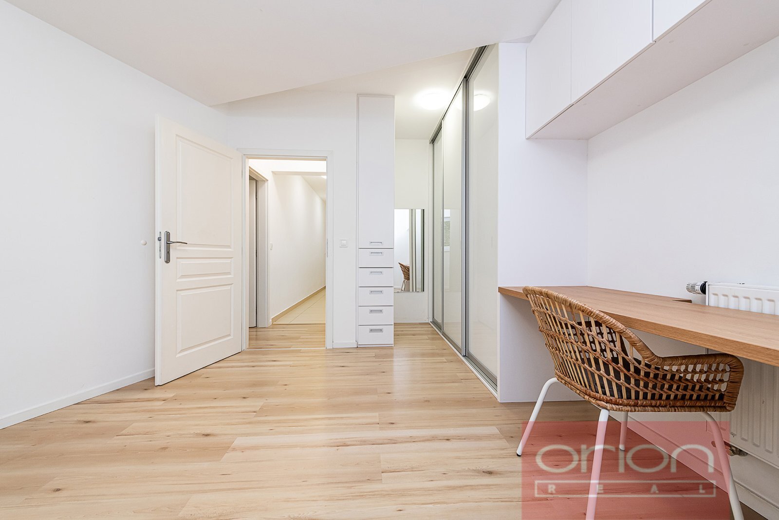 We offer for sale an exceptionally spacious four bedroom apartment with a balcony on the 1st floor of a smaller apartment building with an elevator located in a quiet residential area of Prague 5 - Hřebenka, in close proximity to the Klamovka park. The apartment has a total area of 125.88 sqm and also includes a parking space in the underground garage. There is a plot of land with greenery, which is accessible directly from the apartment. The apartment underwent a high-quality renovation in 2022. The layout of the apartment offers an entrance hall, a spacious hallway with built-in wardrobes, a separate kitchen with a modern kitchen unit with a Dekton worktop and all kitchen appliances, 5 rooms, 1 bathroom with a shower and toilet, 1 bathroom with a bathtub, 2 separate toilets and a utility room with a washing machine, dryer and built-in storage. The apartment features built-in furniture, wardrobes in two bedrooms, high-quality vinyl floors. Heating is provided by a gas boiler in the house. The house is located in a quiet residential area of one of the most desirable Prague locations, Smíchov-Hřebenka, which provides a combination of peace, greenery, all civic amenities and excellent transport accessibility. The bus and tram stop is about 2 minutes walk, then about 10 minutes to the Anděl metro station, where the Nový Smíchov shopping center is located. By car, quick connection to the city ring road and the highway network, Václav Havel Airport is approximately 20 minutes away by car. The apartment is ideal for family living, but also as an investment. It offers generous space, privacy, a high standard of equipment and an excellent location near the city center, but also nature.