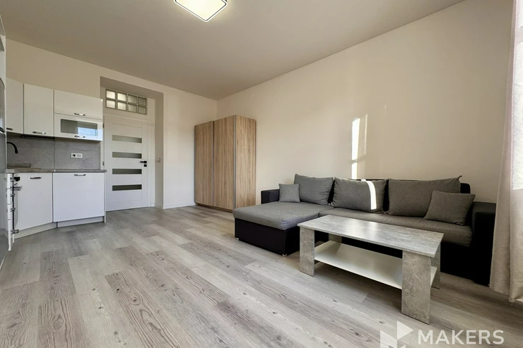 The apartment is situated in a brick residential building and is held in private ownership. The 1+kk layout offers a functionally designed living space with a kitchenette and a separate bathroom, ensuring comfortable and practical living.