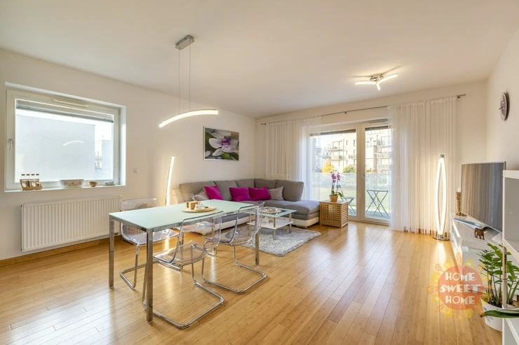 The apartment consists of an entrance hall (15.20 m²), a living room with a kitchenette (28.70 m²) and access to a balcony (5 m²) with a beautiful view of the adjacent park. The kitchen is equipped with modern appliances, including a ceramic hob, electric oven, microwave, dishwasher, fridge-freezer, coffee machine, and extractor hood. There is also a bedroom (12.20 m²) with its own bathroom with shower and toilet (3.40 m²), a children's room/study (10.90 m²), a second large bathroom (6.20 m²), and a separate toilet (2.20 m²).