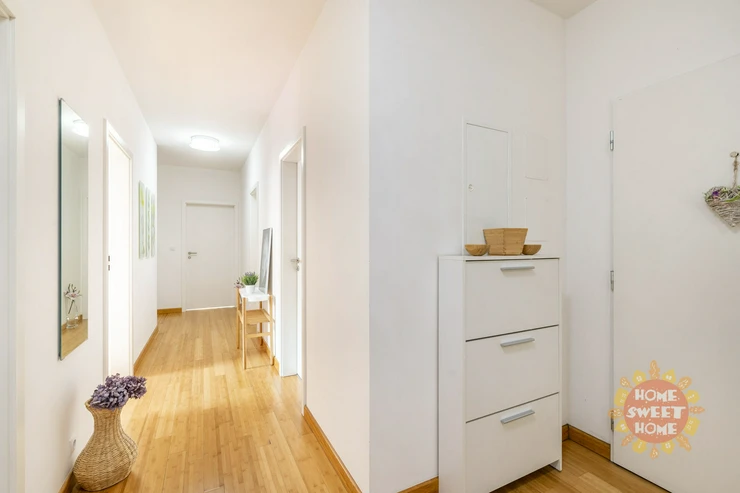 Thanks to the apartment's east, south, and west orientation, it is sunny throughout the day. High-speed internet connection is a matter of course. The apartment is equipped with central heating, which ensures a pleasant atmosphere all year round. Wood-bamboo flooring and tiles give the interior a modern, natural character. An underground garage parking space, cellar (3.30 m2), and apartment furnishings are included in the purchase price.