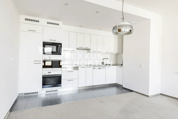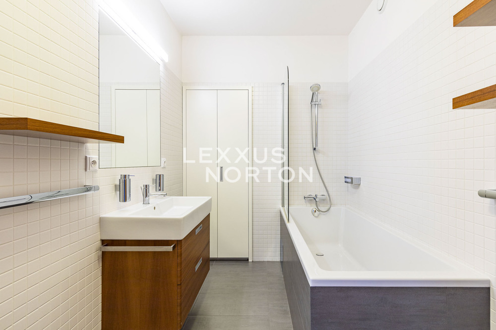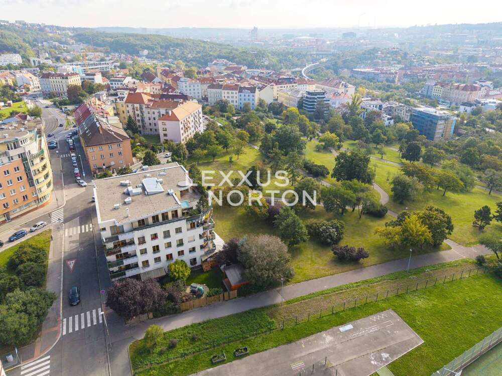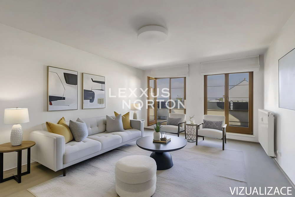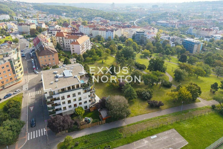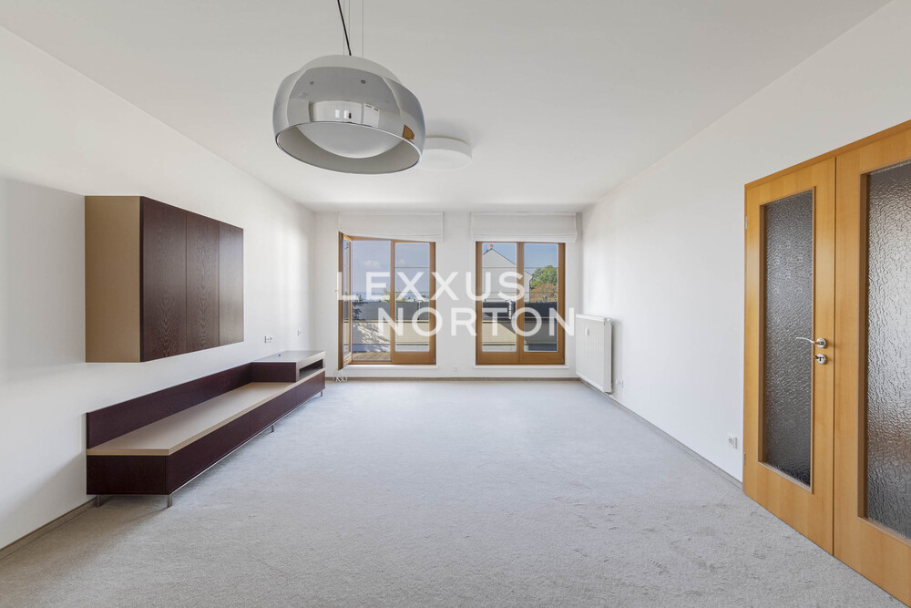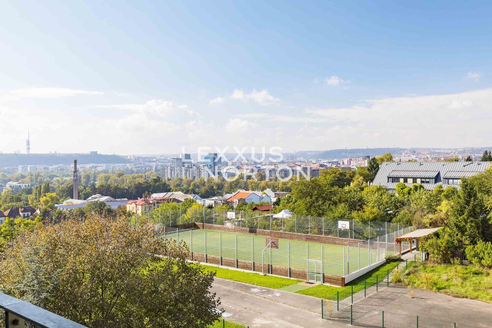 We present a spacious 2-bedroom apartment with a living room and kitchenette offering a stunning panoramic view of the city that you will never tire of, while also providing a valuable sense of privacy. The unique location of the residential building directly adjacent to a park, combined with its position on the top floor, guarantees an exceptional living experience.The smaller residential building Sara, located in Prague 8, is just a few meters from the Korab Sports Centre, with easy access to the city center and a tram stop only a few minutes’ walk from the building.The apartment has a total area of 73.1 sqm and features a spacious living room with a modern, high-quality fitted kitchen and access to a terrace. The entrance to the apartment is designed as a central hallway with built-in furniture and double doors leading into the living room, from where city views unfold. From the hallway, there is also access to the main bedroom and a second, smaller bedroom. All rooms have west-facing French windows with access to the terrace. The remaining part of the apartment consists of a bathroom with a bathtub and a separate toilet.The apartment is equipped with a kitchen fitted with Miele appliances, and high-quality carpeting in the living areas. Heating is provided centrally via the building’s district heating connection.The offer includes parking for two cars in a separately lockable area in the basement of the building, along with a large storage room of 15 sqm.The Sara residential building was completed in 2003 and features a central staircase with an elevator and natural daylight thanks to a glazed atrium. Both the building and the apartment are regularly maintained and are in very good condition.The location is very quiet and offers a perfect balance between urban living and easy access to nature, with the Pod Korabem park directly behind the building and convenient connections to cycling paths along the Vltava River.