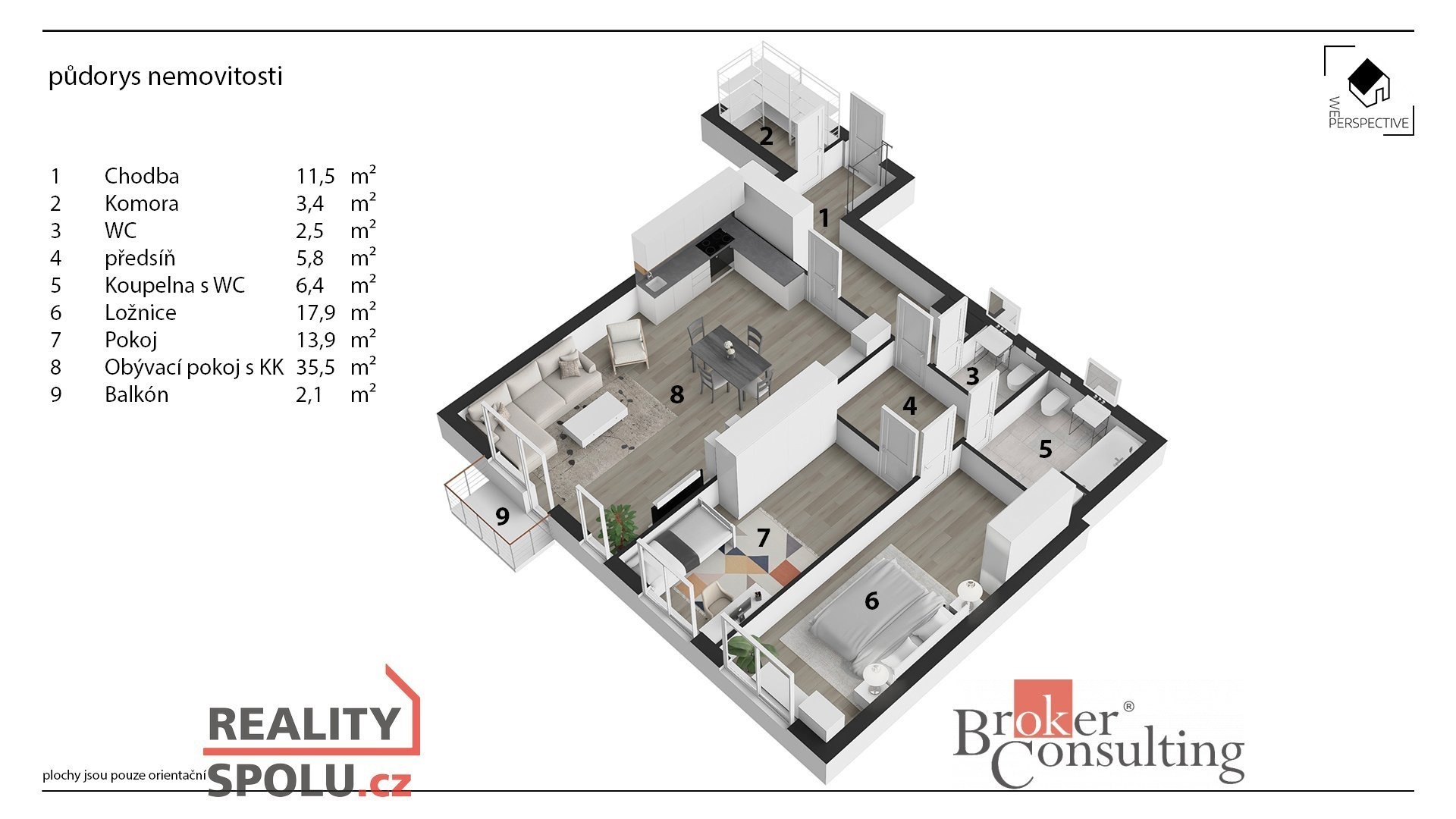 Byt o celkové výměře 107 m² nabízí komfortní dispozici: hlavní obytný prostor propojuje kuchyňský kout, jídelnu a obývací část, ze které je vstup na balkon. Dále jsou zde dvě samostatné místnosti – ložnice a pokoj, koupelna s toaletou, samostatné WC, úklidová komora a prostorná vstupní chodba.