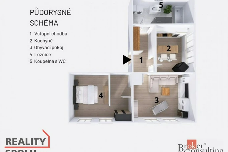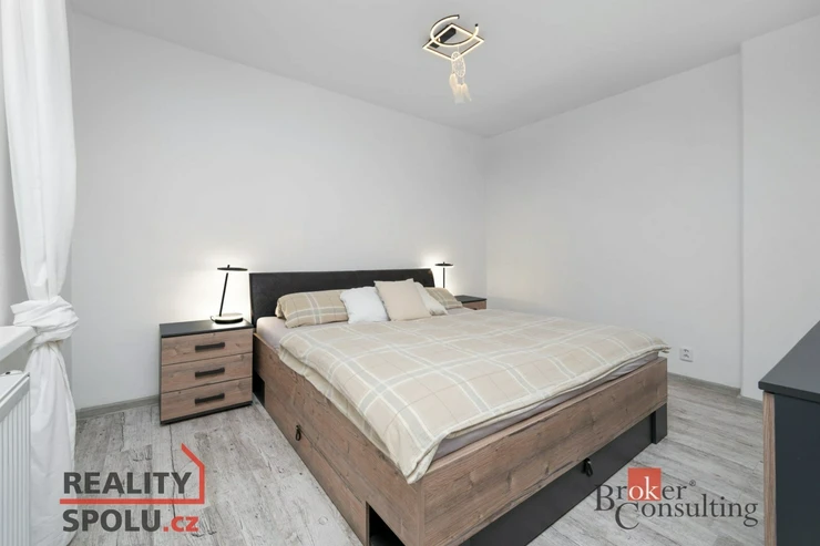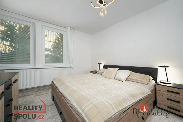 Dispozice bytu lze jednoduše upravit díky sádrokartonové příčce v ložnici oddělující pracovní kout. Posunutím by vznikl dostatečný prostor na vybudování i dětského pokoje.