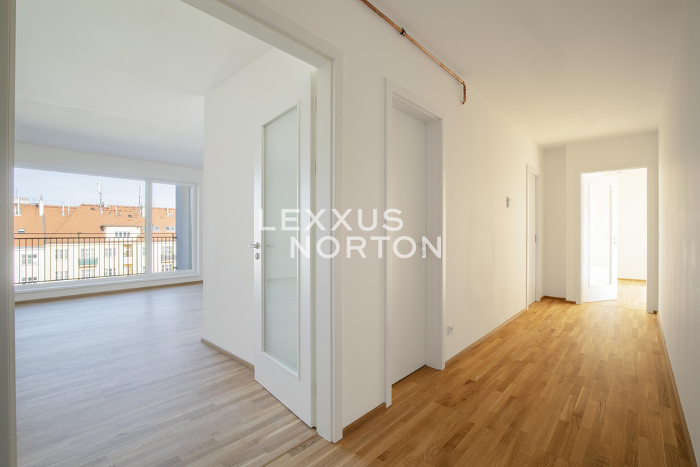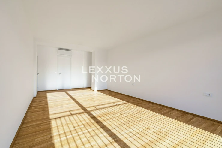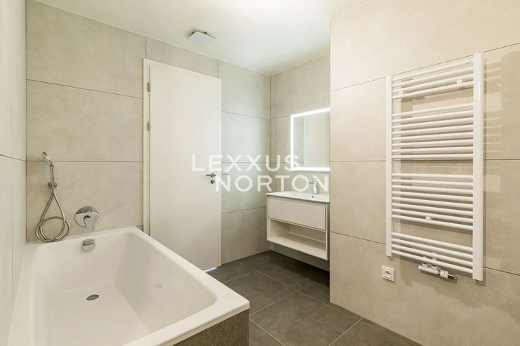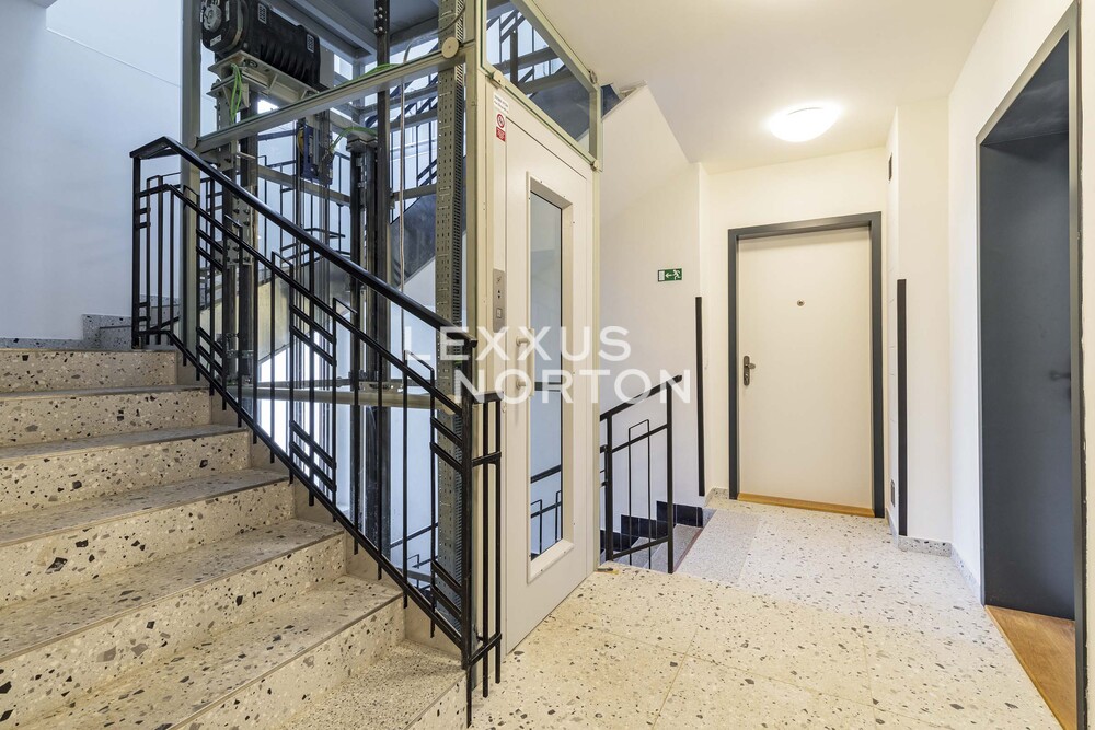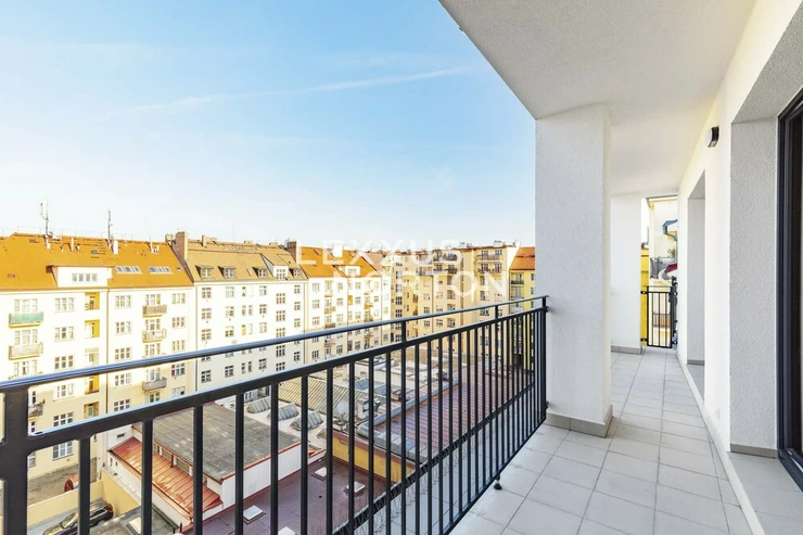 The new modern 2-bedroom apartment with terrace is part of the revitalization project of a corner apartment building from the beginning of the 20th century with the construction of two new upperfloors. The house is set in a vibrant original residential area with all the infrastructure and at the same time in the direct vicinity of the Zidovske pece, Vitkov and Parukarka parks.The apartment unit consists of a very spacious, large-format windows-lit living room with a kitchenette, from which there is access to a terrace facing a quiet courtyard, and two bedrooms. There are two bathrooms, first with a bathtub and second with shower and an entrance hall. The apartment can also be solved as a 3-bedroom layout with a simple intervention.The apartment is finished to a high standard. Three-layer oak floors, large windows with anthraciteplastic-aluminum frames, outdoor blinds, large-format La Futura tiles in the bathrooms and premiumbrands of Ideal Standard, Kaldewei and Hüppe sanitary ware. The apartment is heated by a gascondensing boiler with underfloor heating. Air conditioning is available.The house has a new elegant facade that unifies the space of the original building and the new building on the upper floors. The common areas are undergoing renovation. The elevator has an exit directly on the individual floors. It is possible to purchase a cellar with the apartment.The location of upper Zizkov offers complete comfort of urban living in a stabilized residential area, in direct proximity to greenery with the possibility of relaxation and at the same time with quick access to the city center. Fast connections to the center are provided by numerous tram lines or a bus with connections to metro lines A, B and C.