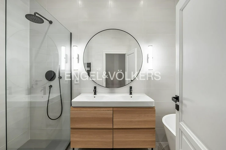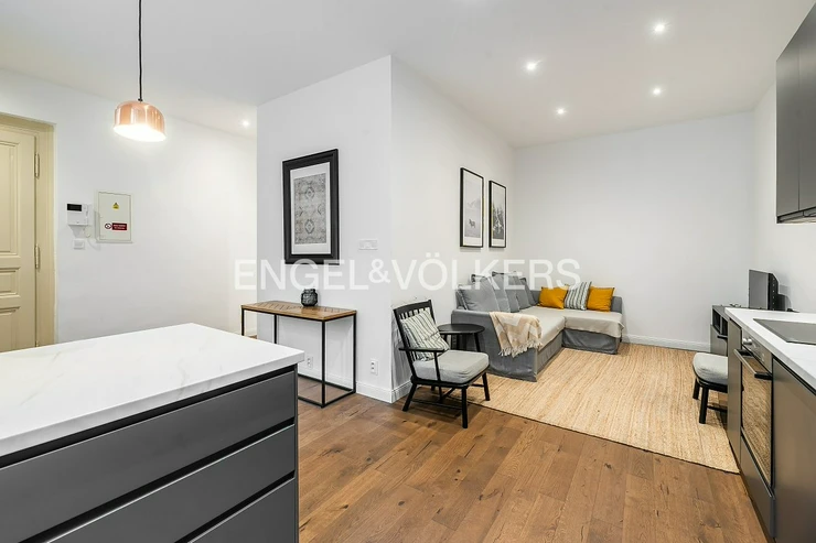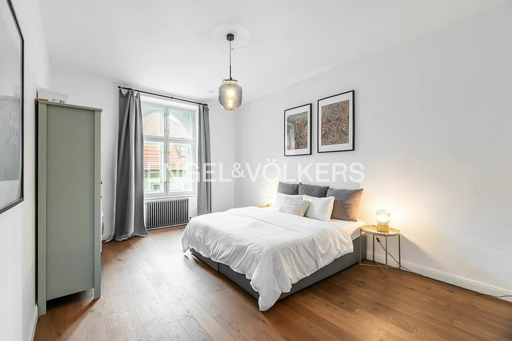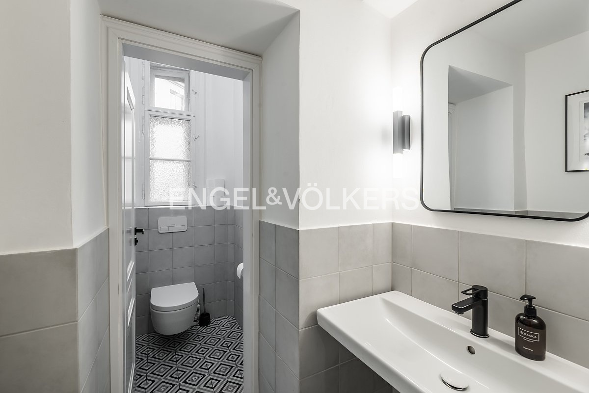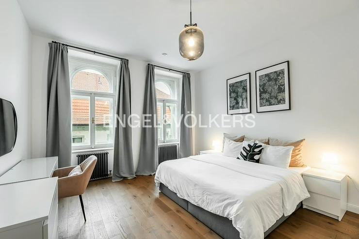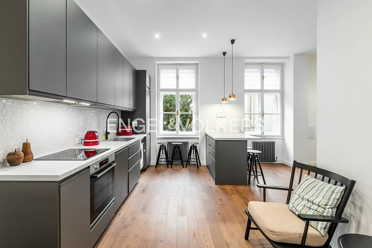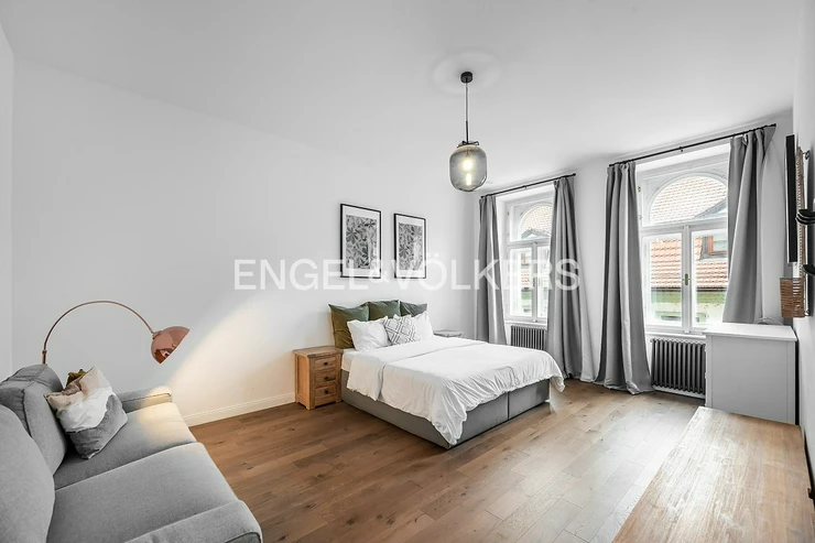 The apartment was completely renovated in 2023 and features high ceilings. The layout includes an airy entrance hall, which is directly connected to the living area and kitchen, three separate bedrooms, a bathroom with a bathtub and shower, and a separate toilet with a sink. The apartment faces the street and the courtyard; the living area with a kitchen island faces the courtyard with a view of trees, while the bedrooms with new insulated windows face west towards Letenská Street. The apartment has insulated and refurbished casement windows, and the entrance door is a traditional double door. Heating is provided by central heating.