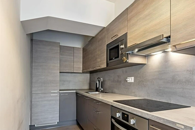 The kitchenette has Oresi brand cabinetry, a refrigerator with freezer, a ceramic hob, electric and microwave ovens, a dishwasher, and a hood.