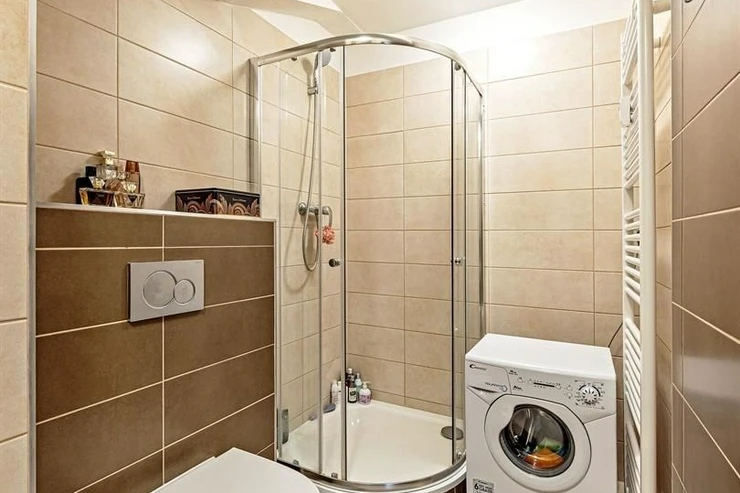 The bathroom includes a shower, toilet, washing machine, and storage space.