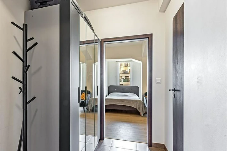 The apartment is fully furnished and features an entrance hall with a wardrobe, coat rack, and shoe storage. From the hallway, you enter the bathroom and a room with a kitchenette.