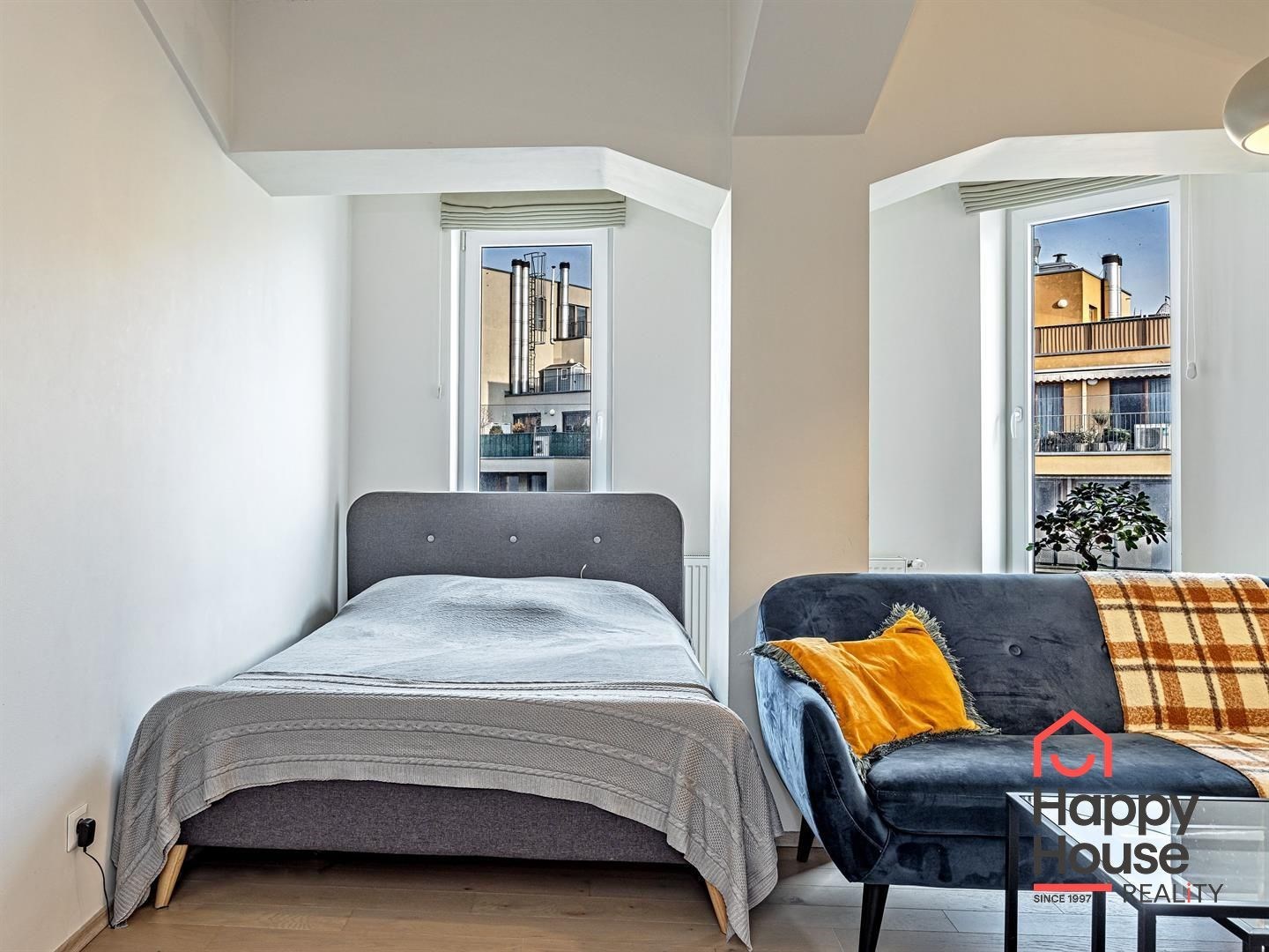 The main room has 3 French windows overlooking the inner block with mature greenery and the Vltava River.