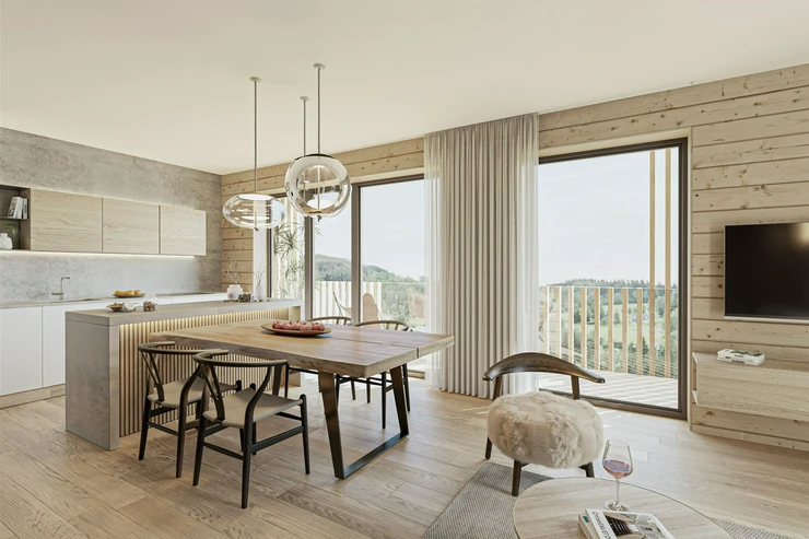 The apartment also includes a terrace of 5 sq.m., which provides an ideal place for relaxation and direct access to the garden. An advantage is the southern orientation of the apartment, thanks to which the interior is bright and sunny for most of the day. All other available apartments can be found directly on the Rokytná Resort website.