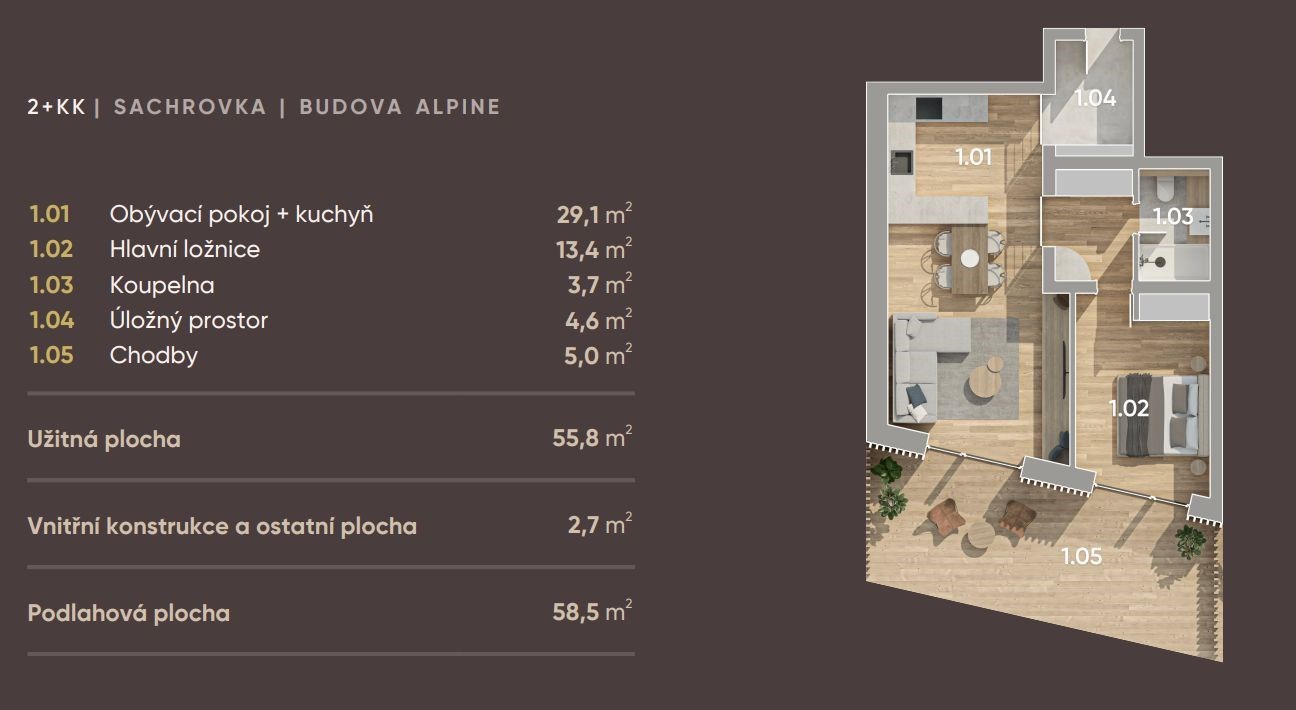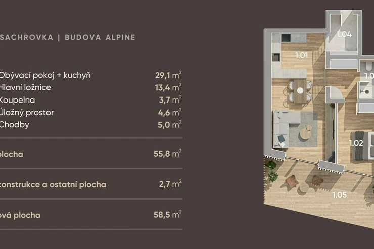 The featured 1 bedroom apartment is situated on the ground floor of the Alpine house and has a total living area of 59 sq.m..