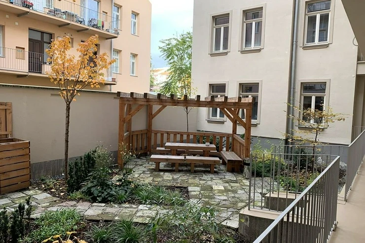 The building has a charming gallery-style architecture with a touch of historical character, perfectly combining the spirit of old Brno with the comfort of modern living.