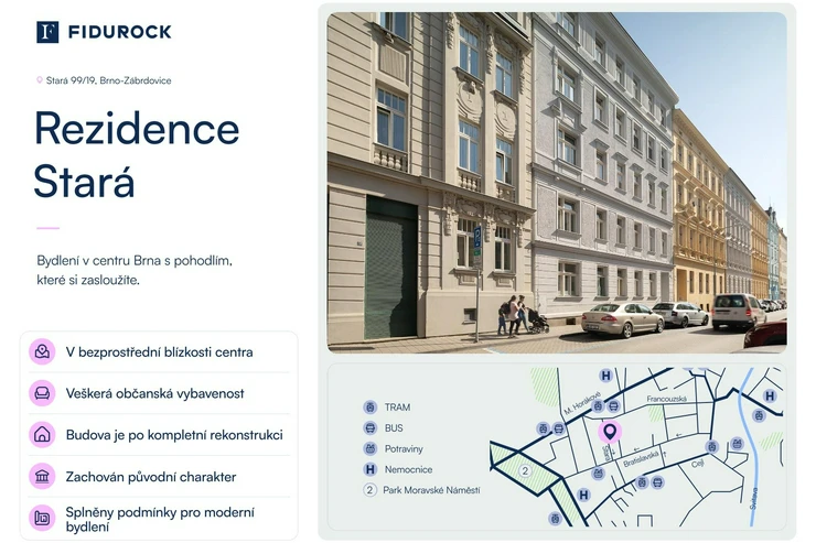 One of the most desirable addresses in the city centre of Brno – the quiet Stará Street is just a few minutes’ walk from Freedom Square (Náměstí Svobody), the main train station, and Vaňkovka Shopping Centre.