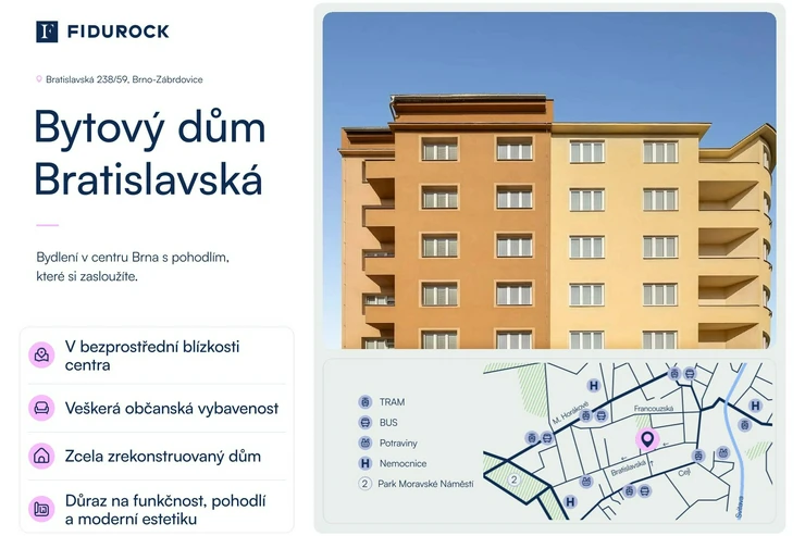 We are pleased to offer for sale a beautiful and bright 1+kk apartment with a total area of 35.70 m², located on the 1st floor of a renovated residential building at Bratislavská Street 59, Brno–centre.