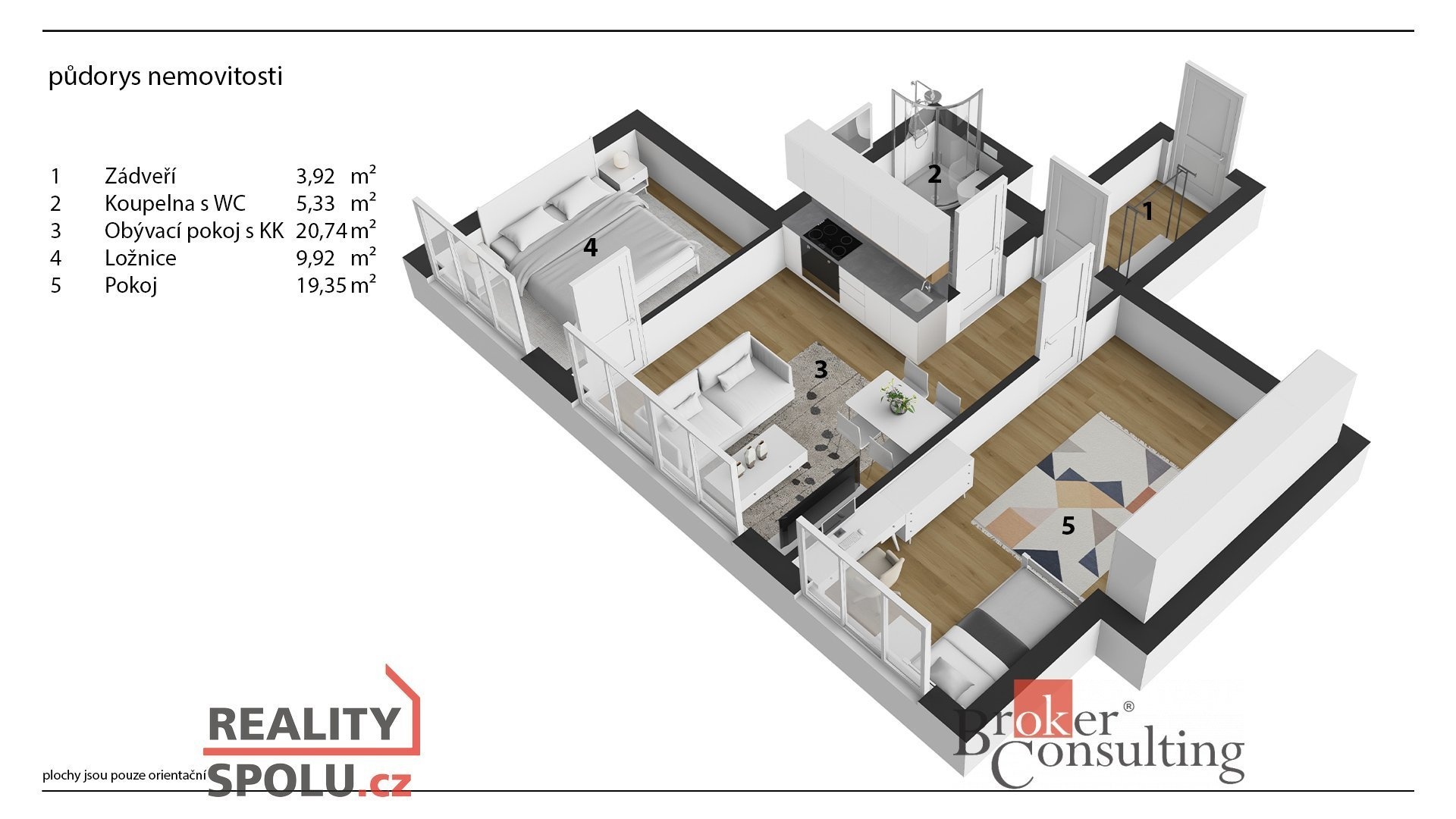 Dispozice 3+kk nabízí praktické členění prostoru – obývací pokoj s kuchyňským koutem, dvě samostatné místnosti vhodné jako ložnice, pracovna či dětský pokoj, koupelnu a vstupní chodbu. V koupelně a chodbě je položena dlažba, v obytných místnostech plovoucí podlaha. Byt je vybaven plastovými čtyřkomorovými okny s trojskly, která zajišťují výborné izolační vlastnosti. Vytápění i ohřev teplé vody jsou řešeny dálkově. Energetická náročnost budovy odpovídá třídě PENB B.
