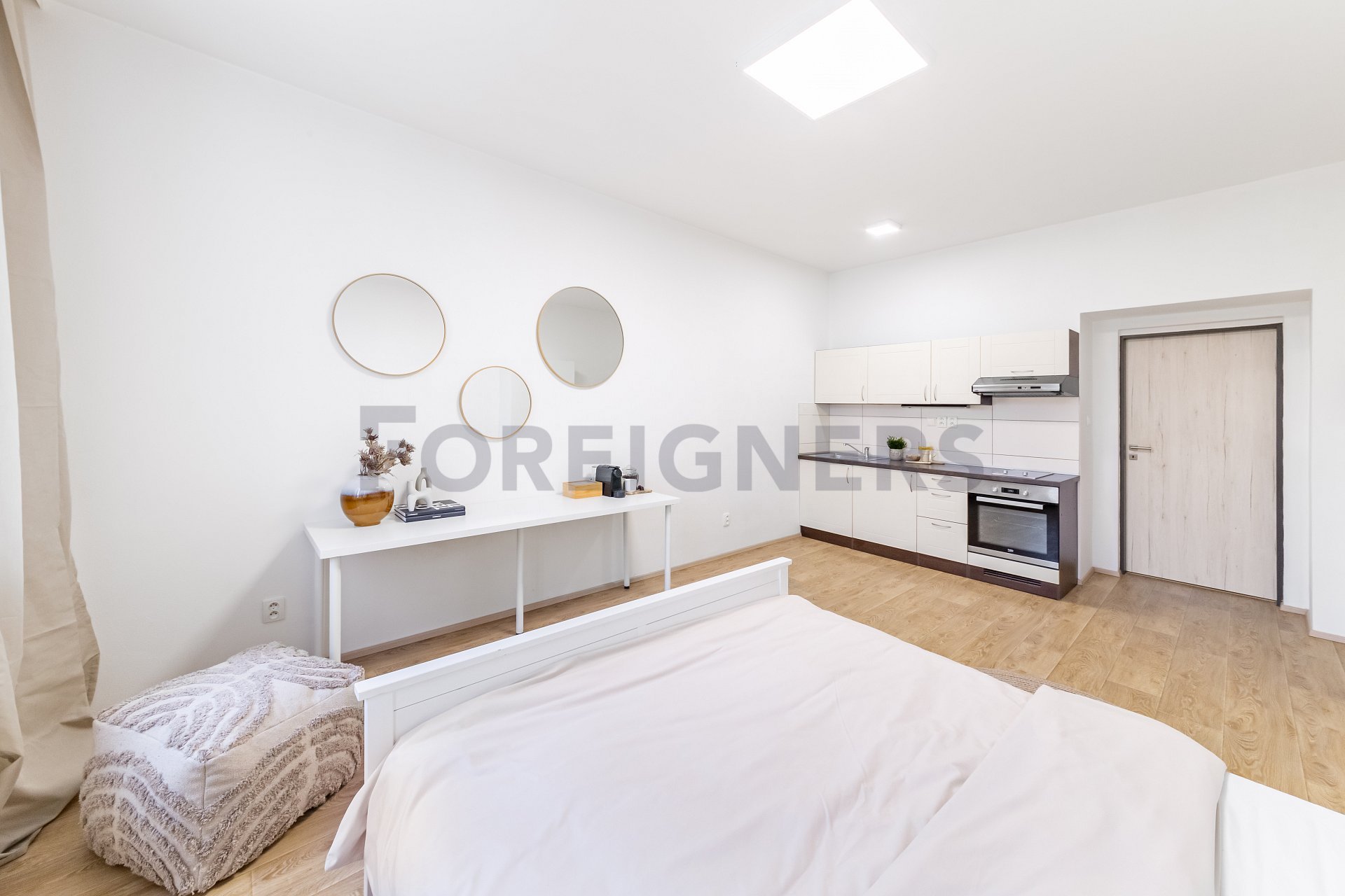 Apartment in the Bratislavská House development project currently used as a show apartment and not available for sale at this time. Apartment 404/A with a 1+kk layout and a total floor area of 32.33 sqm is located on the 4th floor of Building A, facing the street, with north-facing windows.