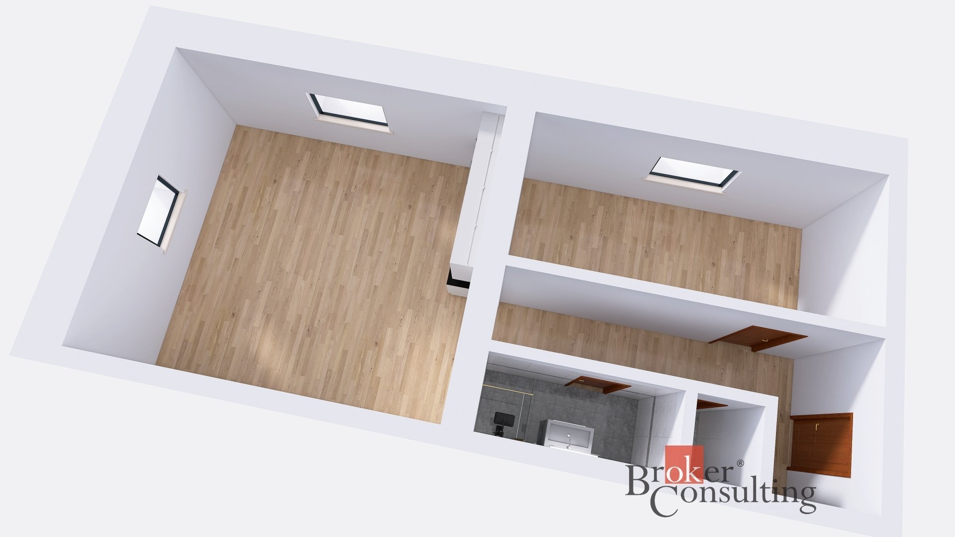 Moderní vybavení: Kuchyňská linka je osazena spotřebiči (indukce, el. trouba, myčka, digestoř). Samostatné WC a moderní koupelna se sprchovým koutem jsou samozřejmostí.