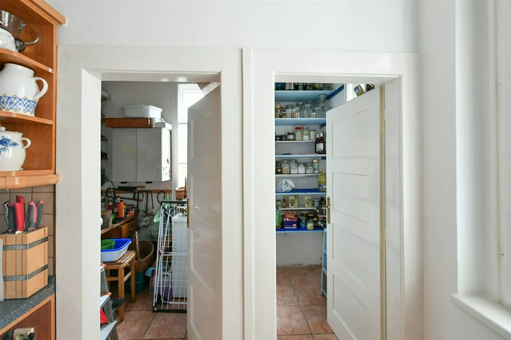 The apartment has a south/north orientation. From the bright entrance hallway in the center of the apartment, to the left, you can enter the kitchen with a pantry and the original servant's room. There's also a separate toilet and a bathroom with a shower, both with windows. At the end of the hallway is a study with ideal diffused northern light. On the right side of the hallway, there are two large rooms with a southern orientation.