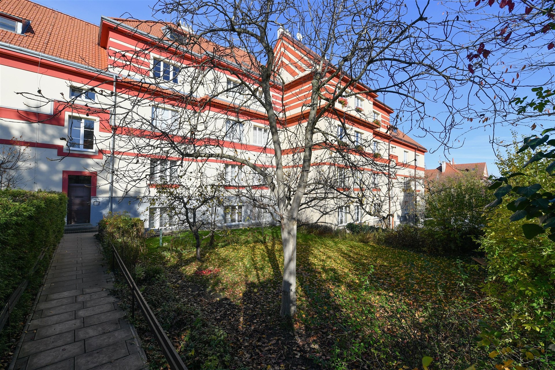 Behind the entrance gate from V Cibulkách street, a private access path leads to the house's front door, flanked by gardens on both sides. There are a total of 9 steps leading to the apartment.