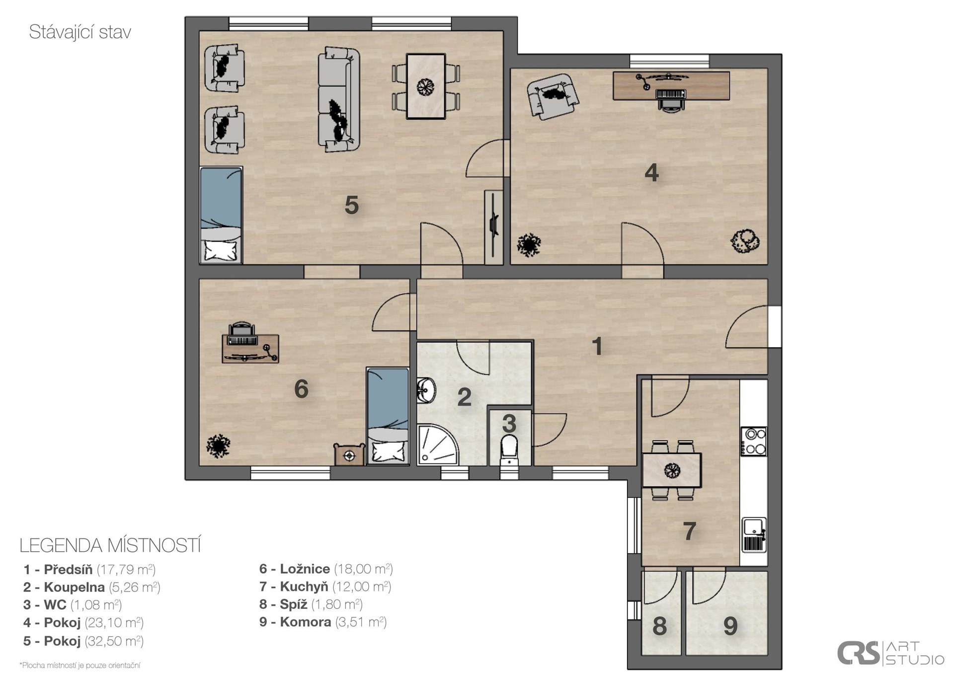 The apartment has been recently occupied and is in very good, well-maintained condition. The interior is currently furnished with wooden furniture in the style of the 70s, as evident from the photographs. The living rooms have preserved parquet floors, hallways are carpeted, while the kitchen and bathroom feature ceramic tiles. An energy performance certificate for the building is not available at the time of the offer’s publication; it is being processed. Similarly, we are working on the solutions for the aforementioned layouts of 4+kk and 4+1, which we will gladly provide.