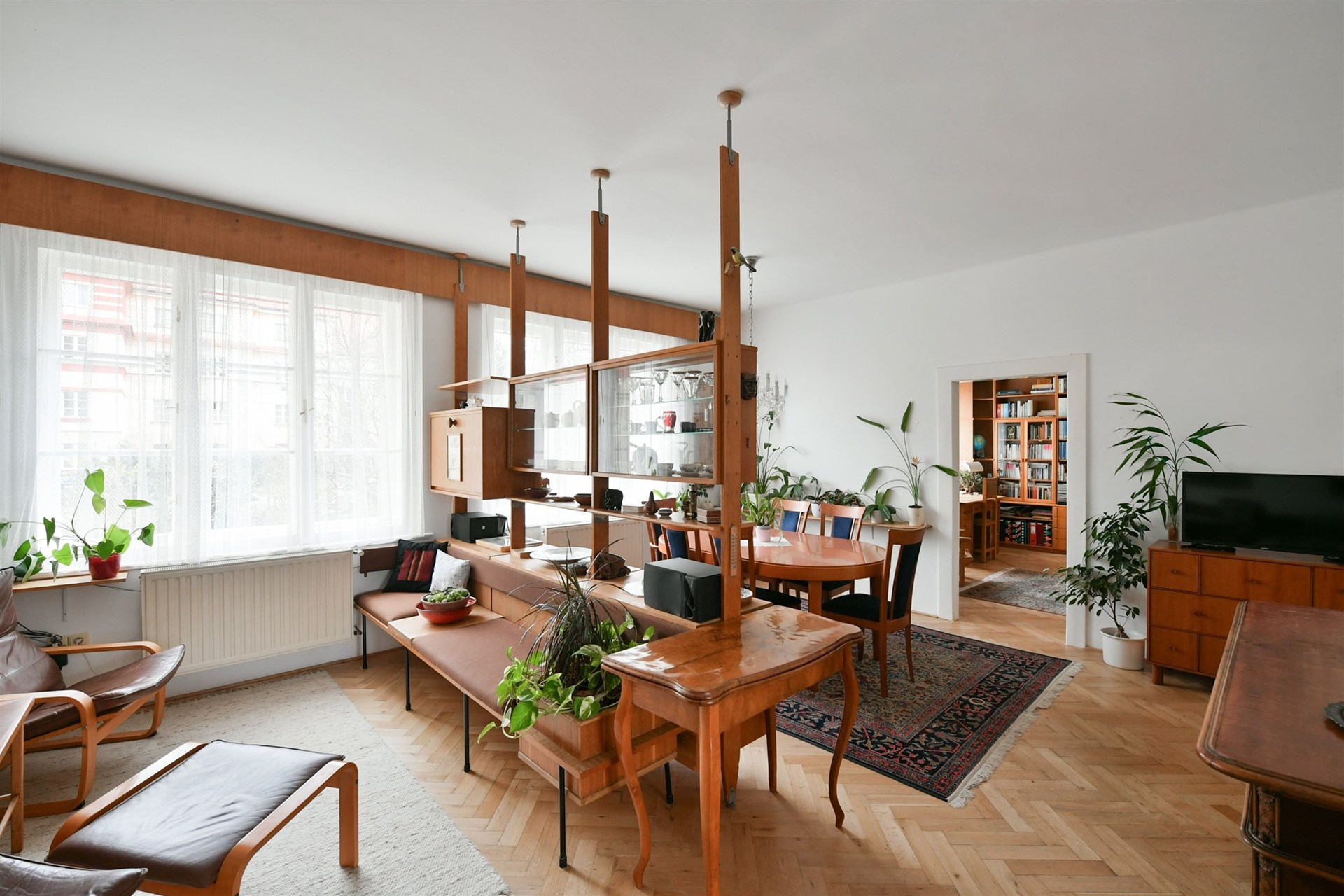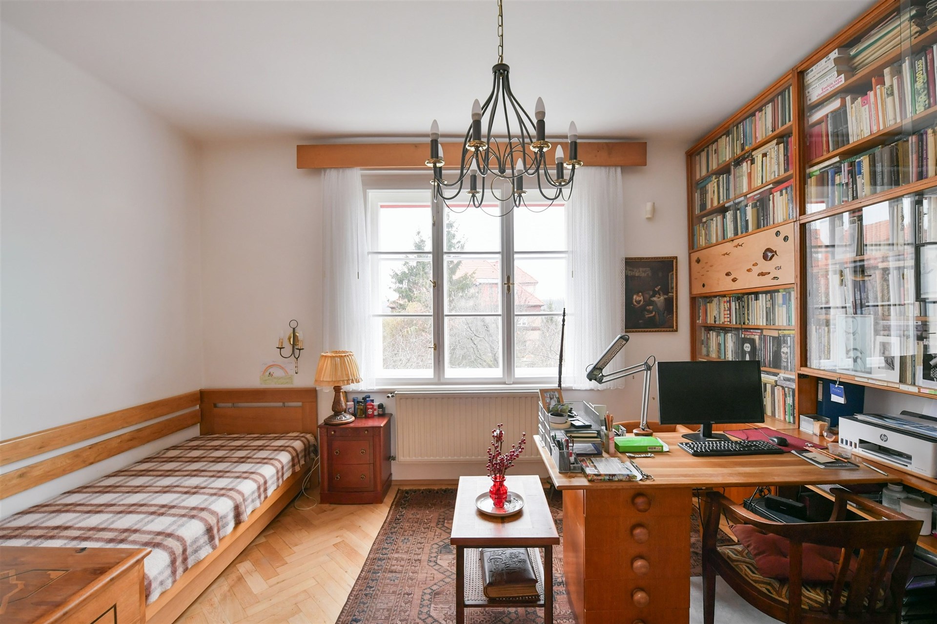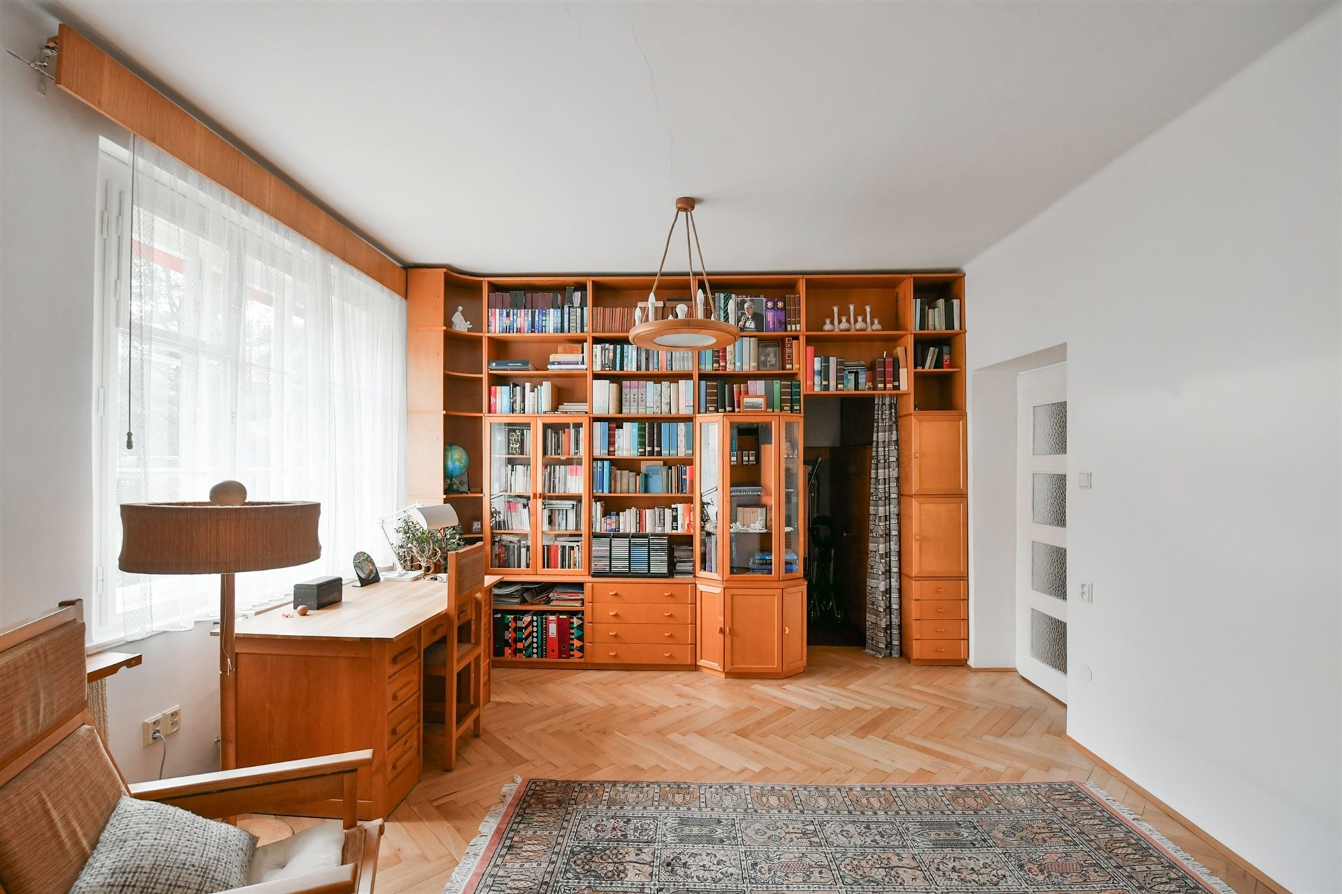 We are offering for sale an exceptional apartment with a current layout of 3+1, with the option to modify it to a 4+kk or 4+1 layout, boasting a total area of 115 m². The apartment is located on the first floor of a house with a garden, which is part of the historically valuable Cibulka villa colony in Prague's Košíře neighborhood. This unique residential complex of inter-war architecture was created between 1924–1926 as a thoughtfully planned urban concept emphasizing quality living, a serene garden environment, and a communal character of the locality.