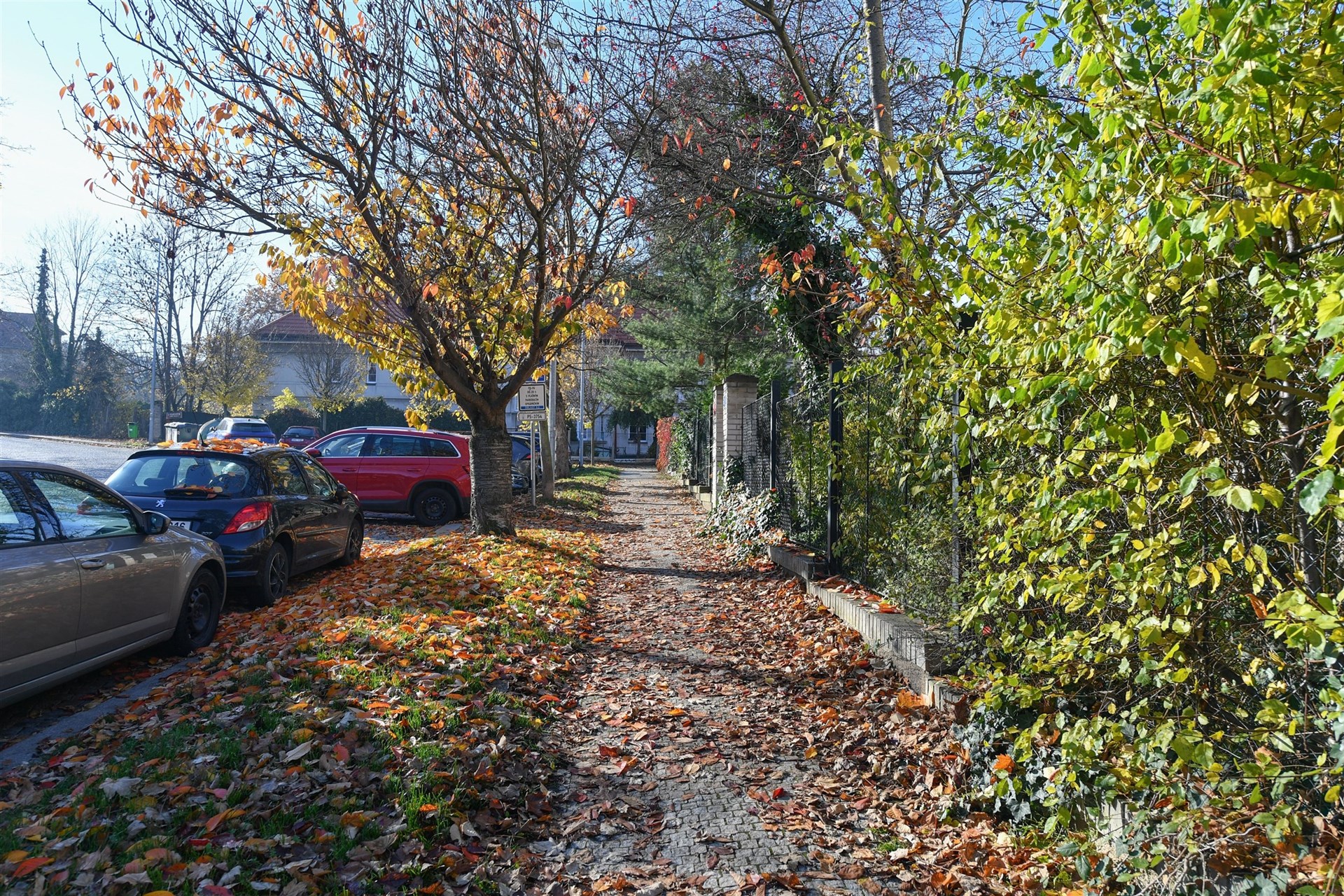 Behind the entrance gate from V Cibulkách street, a private access path leads to the house's front door, flanked by gardens on both sides. There are a total of 9 steps leading to the apartment.