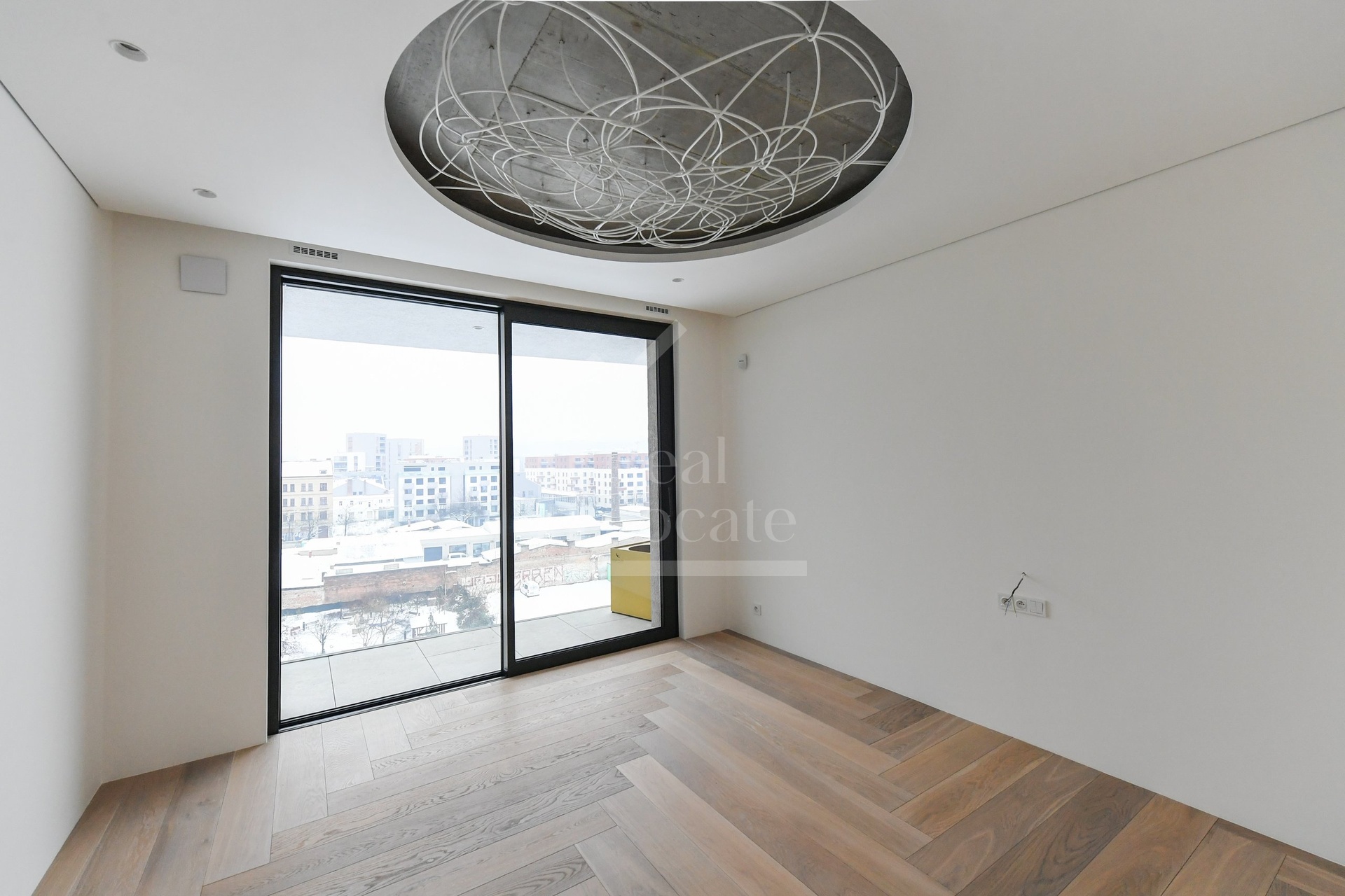The apartment’s 3+kk layout is designed with functionality in mind, clearly separating the living and private zones. The entrance leads into a spacious hallway with ample space for built-in wardrobes and storage. From the hallway, you enter the main living area, which features a generous living room with a kitchen and dining space. This central space is bright and airy thanks to large-format windows and has direct access to the spacious terrace, naturally extending the living area and providing comfortable outdoor seating.