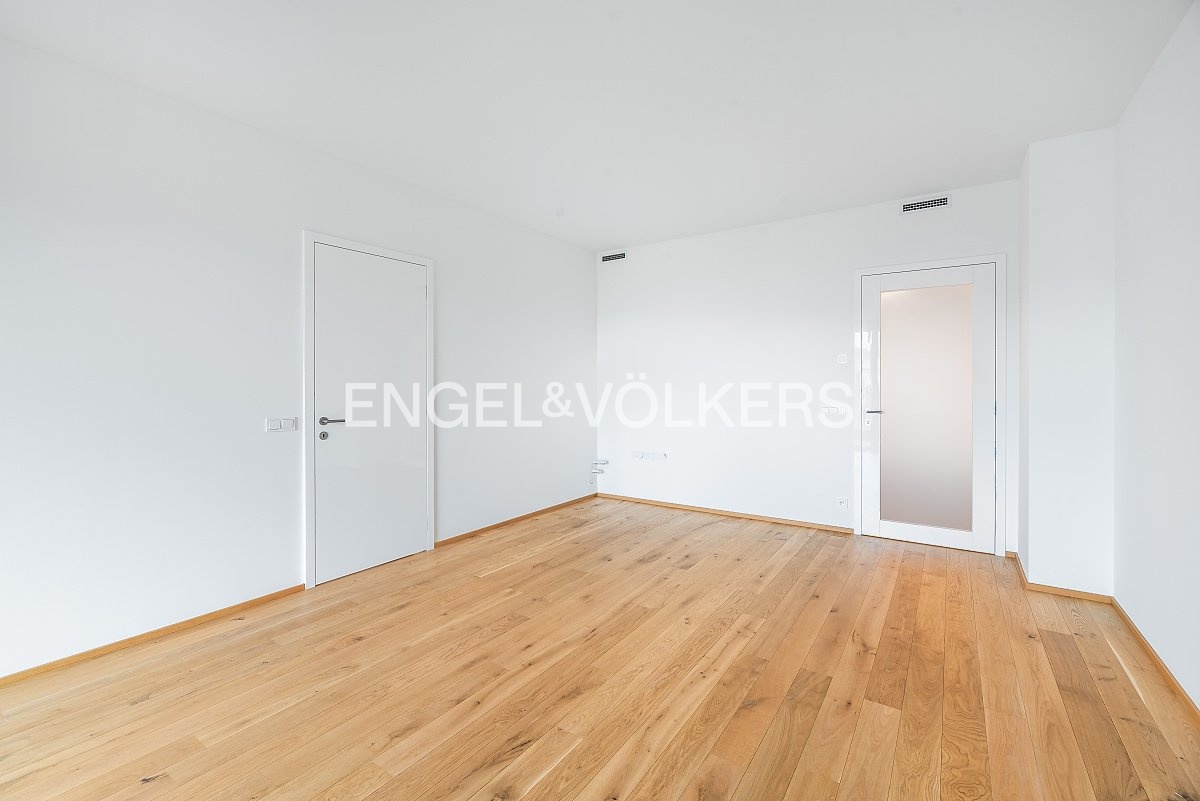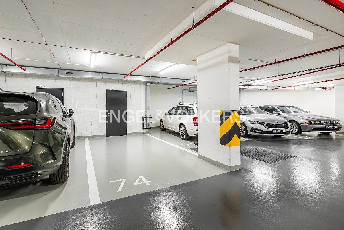 The layout of the apartment is practical and comfortable – the entrance hall leads to a separate toilet with a washing machine connection and to the main living area with preparation for a kitchen unit. The bedroom is connected to its own bathroom with a bathtub. The apartment includes a brick cellar and a parking space in the underground garage.