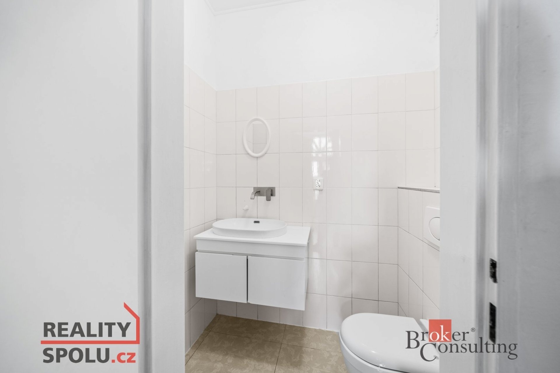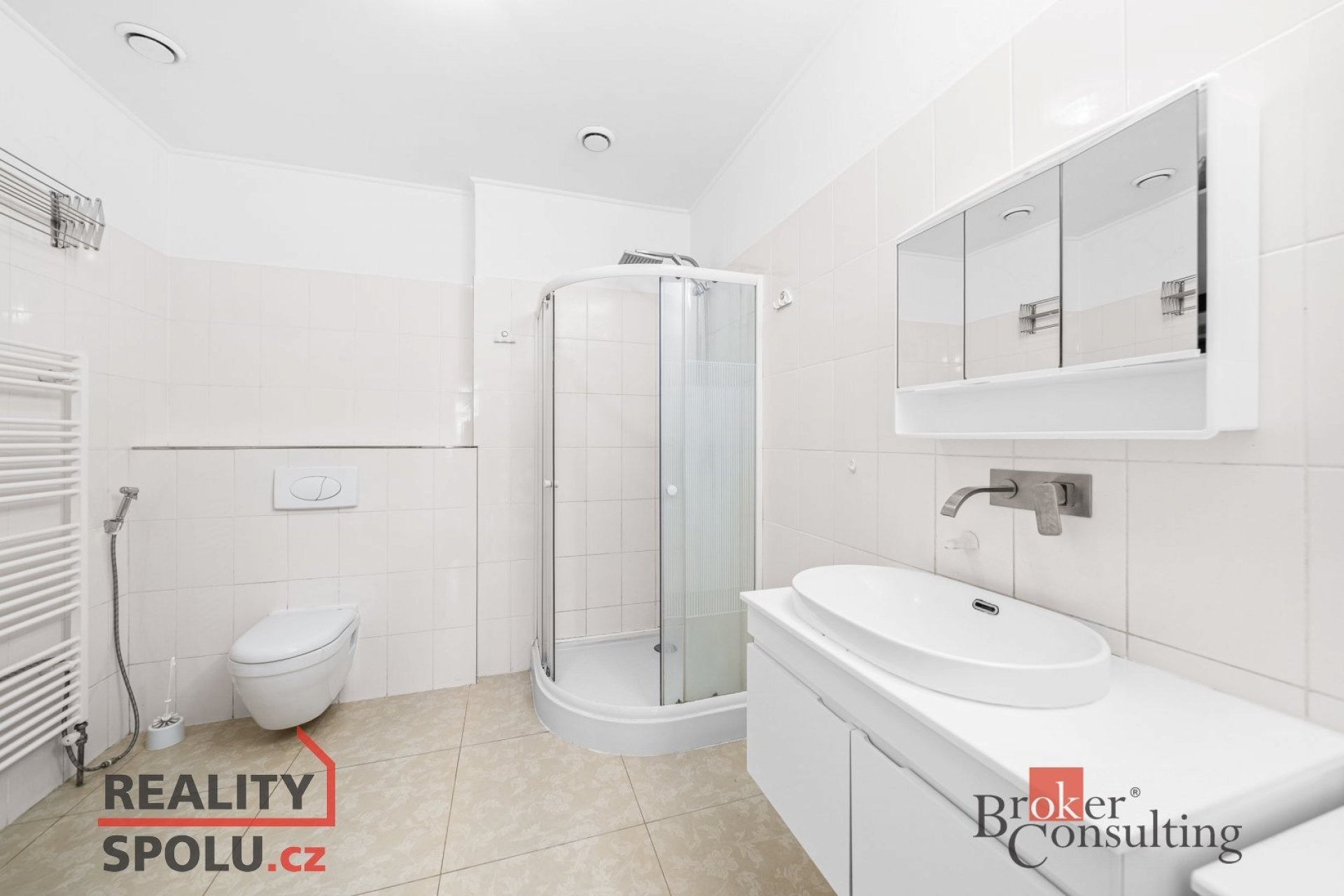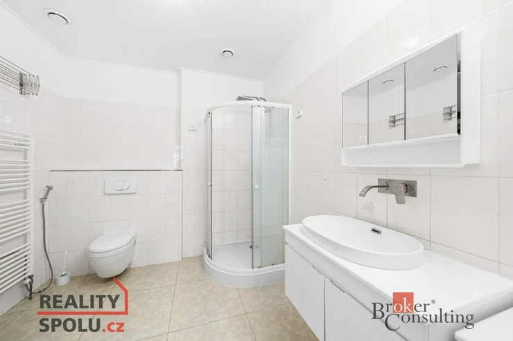 Součástí bytu je koupelna se sprchovým koutem a WC o velikosti 7,6 m², dále samostatná toaleta (3,3 m²) a předsíň o velikosti 6 m² s možností úložných prostor.