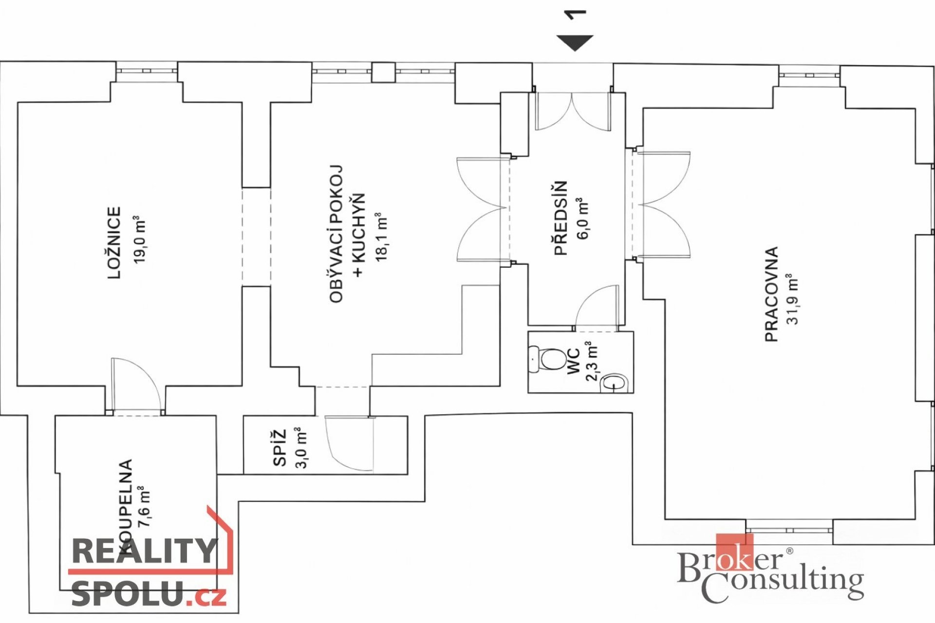 Dispozice bytu je prakticky řešena. Obývací pokoj s kuchyňským koutem tvoří centrální část bytu a je doplněn o samostatnou spíž. Byt dále nabízí ložnici o velikosti cca 19 m² a druhý prostorný pokoj o velikosti 31,9 m², vhodný jako ložnice, pracovna nebo dětský pokoj.