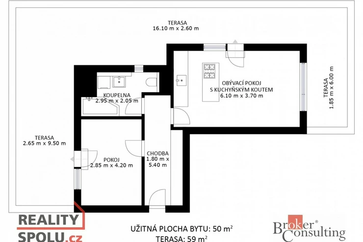 Celý byt obléhá prostorná terasa o velikosti 59 m2, na kterou vede vstup z každého pokoje.