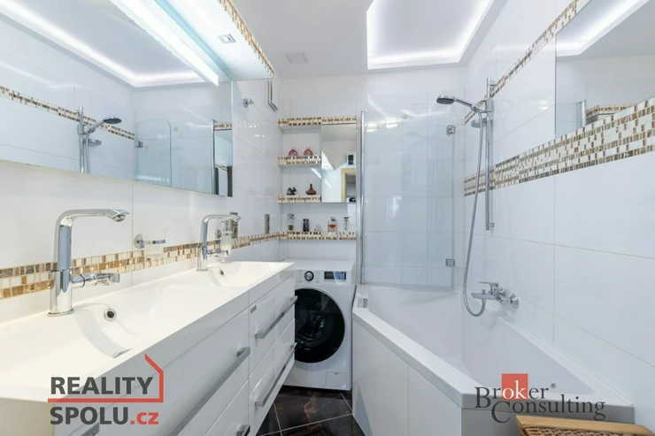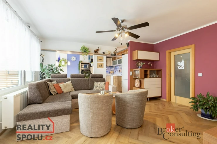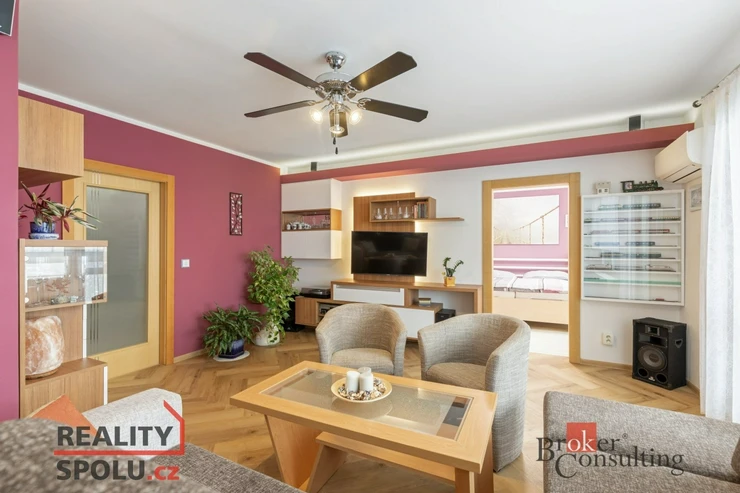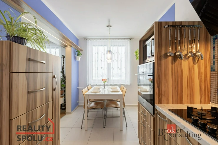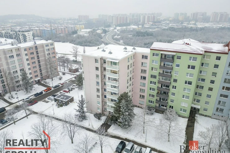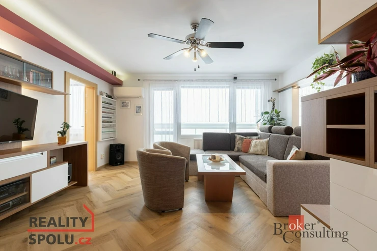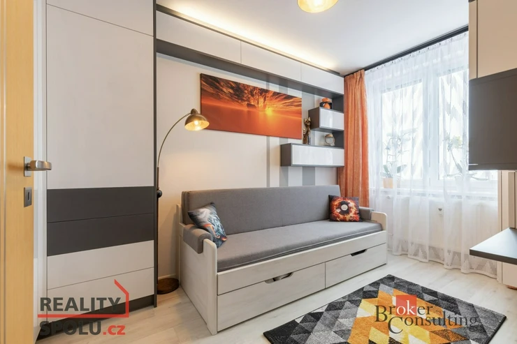 Byt vás přivítá prostornou vstupní chodbou, která působí vzdušně a nabízí dostatek místa pro uložení věcí. Dominantou bytu je prostorný obývací pokoj s nábytkem na míru a klimatizací, odkud je přímý vstup na balkon se zaskleným posuvným systémem. Obývací pokoj je průchozí do prvního pokoje, který je v současnosti využíván jako ložnice. Obývací část je propojena s kuchyní a jídelním koutem. Původní příčka byla odstraněna a prostor dnes citlivě rozděluje prvek v podobě sloupu a částečně zachované horní části stěny, která vyvolává pocit oddělení a zároveň ponechává interiér otevřený. Kuchyně je moderní, kompaktní a prakticky řešená, ideální pro každodenní vaření. Byt dále nabízí další dva samostatné pokoje – jeden o velikosti 12.25 m², ideální jako dětský pokoj či pracovna, a druhý o velikosti 9 m², který nabízí plnohodnotný prostor s variabilním využitím. Předností bytu jsou vestavěné skříně, které jsou v každém pokoji. V bytě je dále samostatné WC a koupelna doplněná o podhled s nastavitelným LED osvětlením, které umožňuje navodit příjemnou atmosféru pro chvíle relaxace.