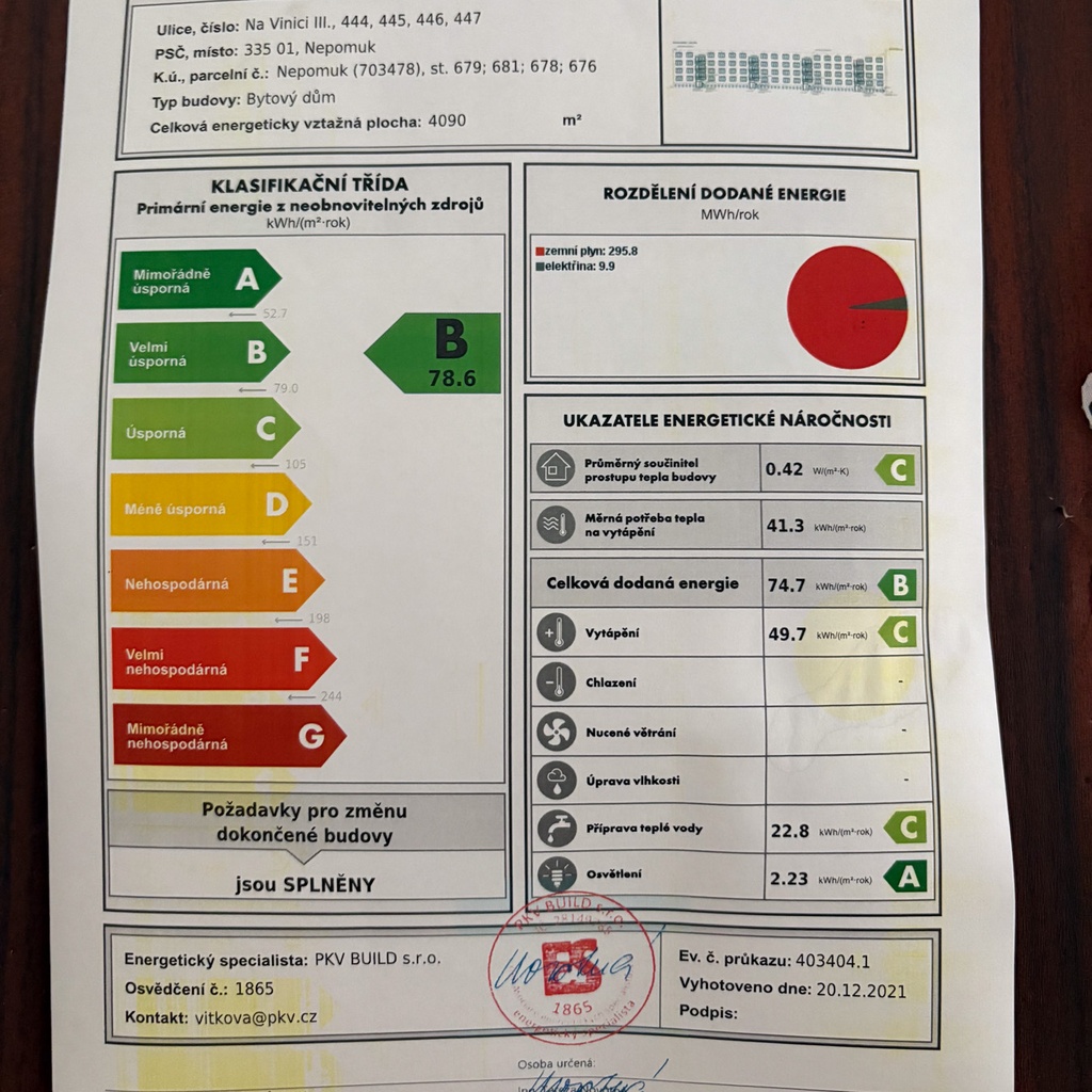 Revitalizovaný dům má zateplenou fasádu, opravenou střechu a nové rozvody. Energetická náročnost je třída B, což se pozitivně odráží na provozních nákladech a komfortu bydlení. Lokalita nabízí klidné prostředí s dobrou dostupností občanské vybavenosti i centra města. Parkování je možné přímo před domem.