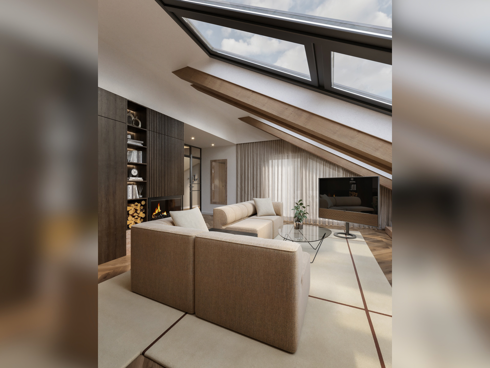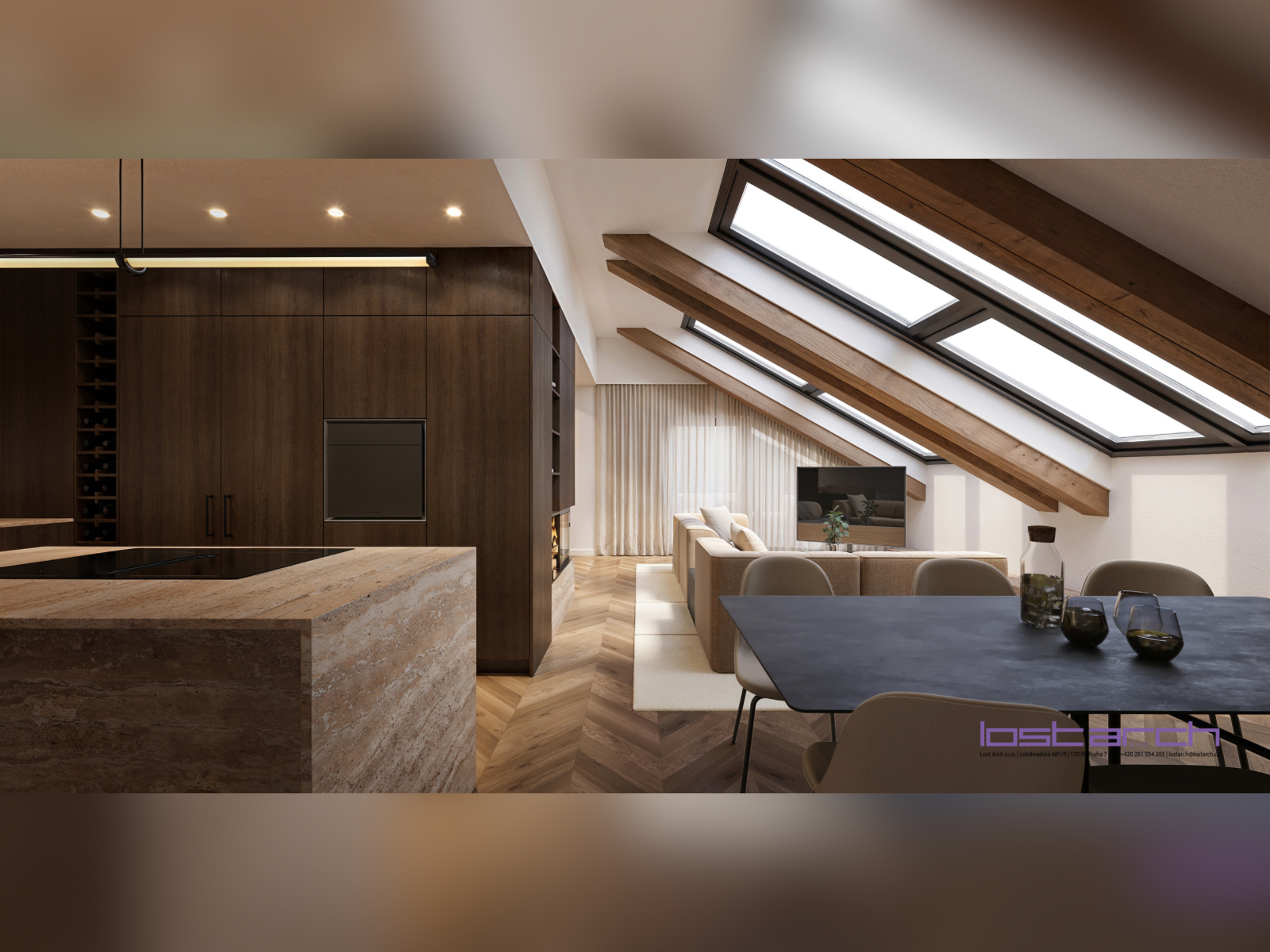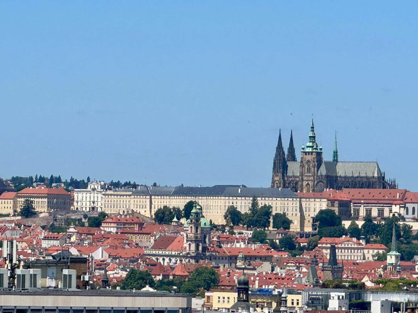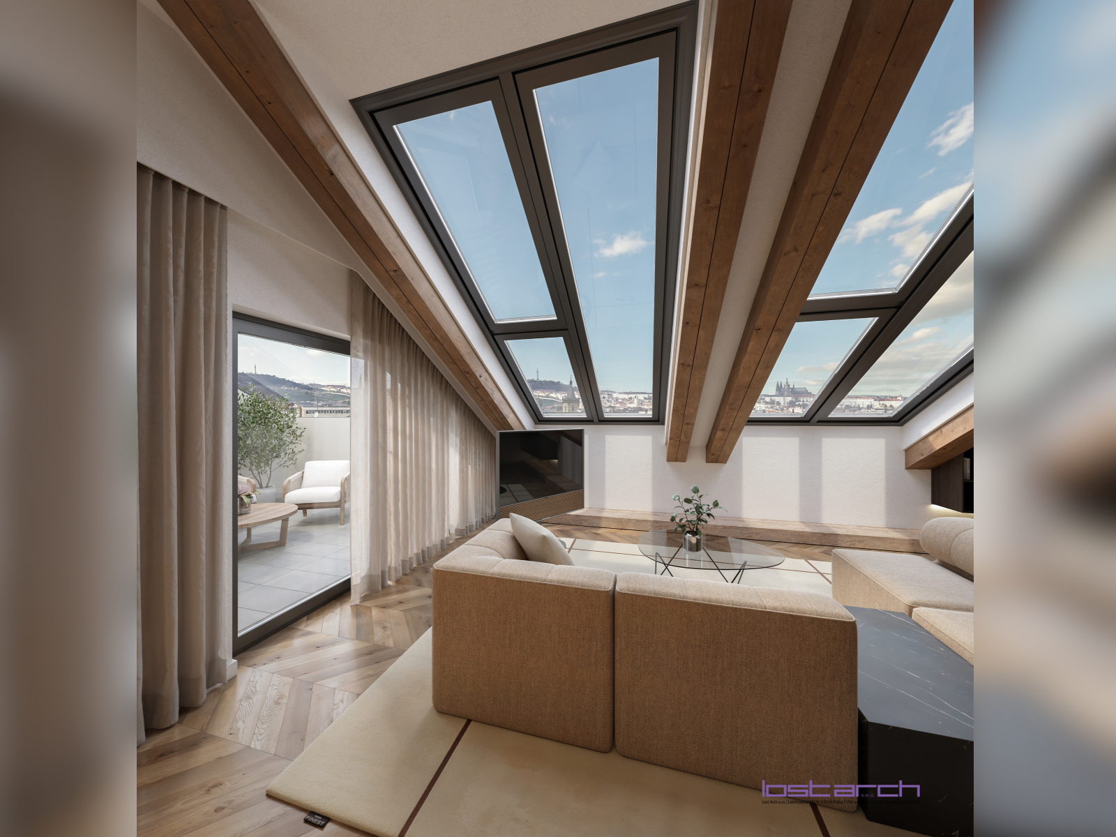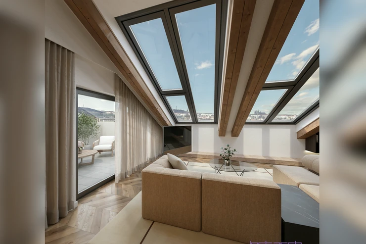 It is a spacious duplex with 3 bedrooms, 2 bathrooms, walk-in closets, a utility room for a washing machine, and a large living room with kitchen. From the living area there is direct access to the terrace with an awning. A beautiful view of Prague Castle can be enjoyed from most interior and exterior spaces of the apartment – thanks to the fact that the building is the tallest in the surrounding area, the view is completely unobstructed. The atmosphere is further enhanced by a solid-fuel fireplace. The apartment is equipped with air conditioning with heat recovery and electronic blinds.