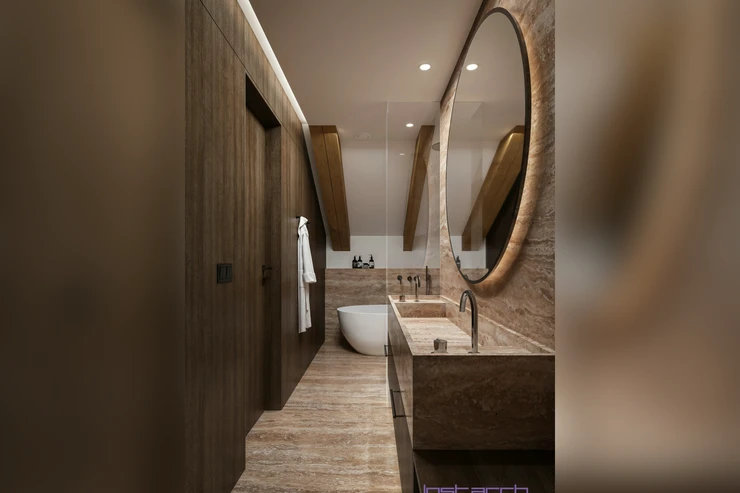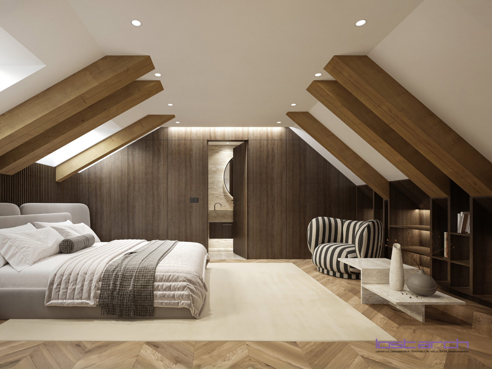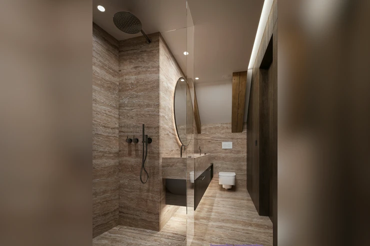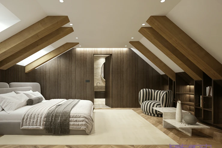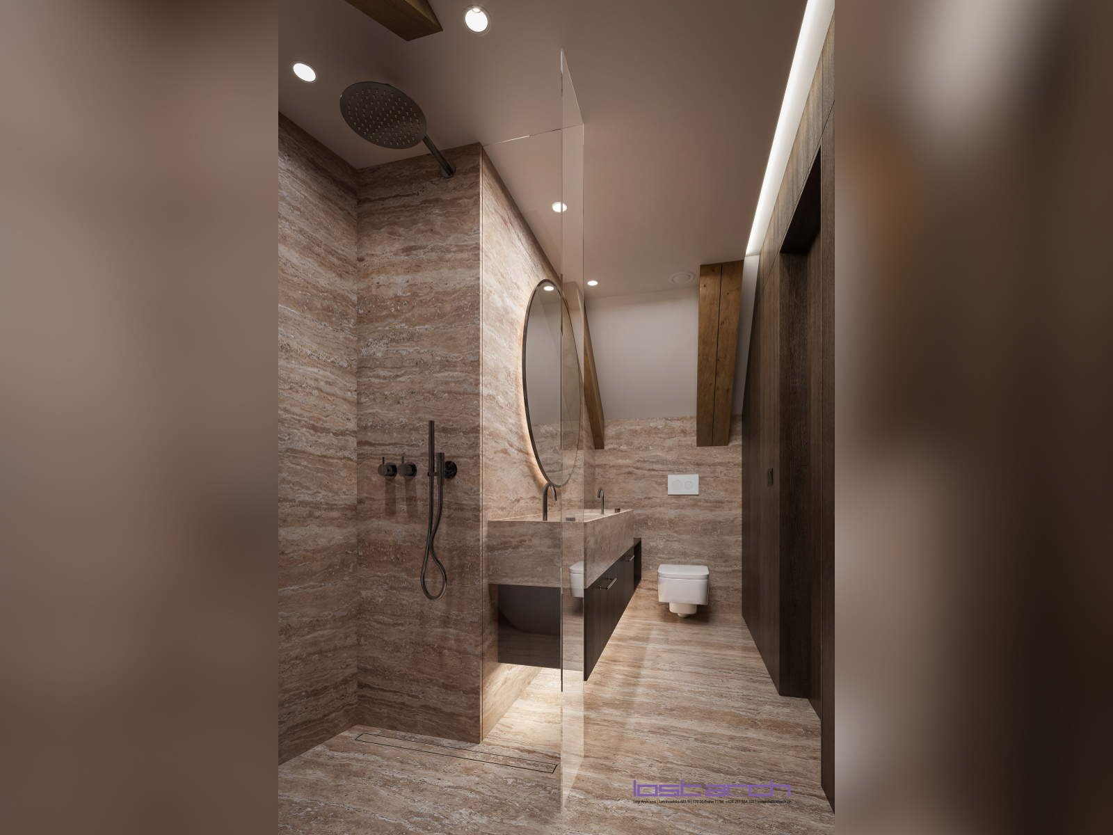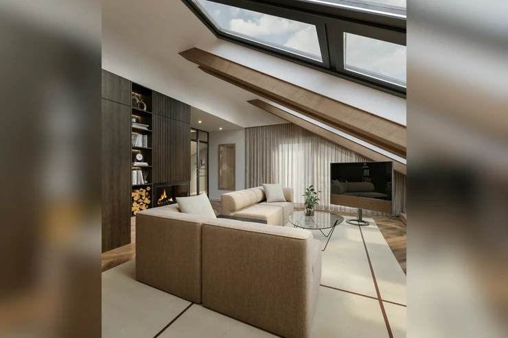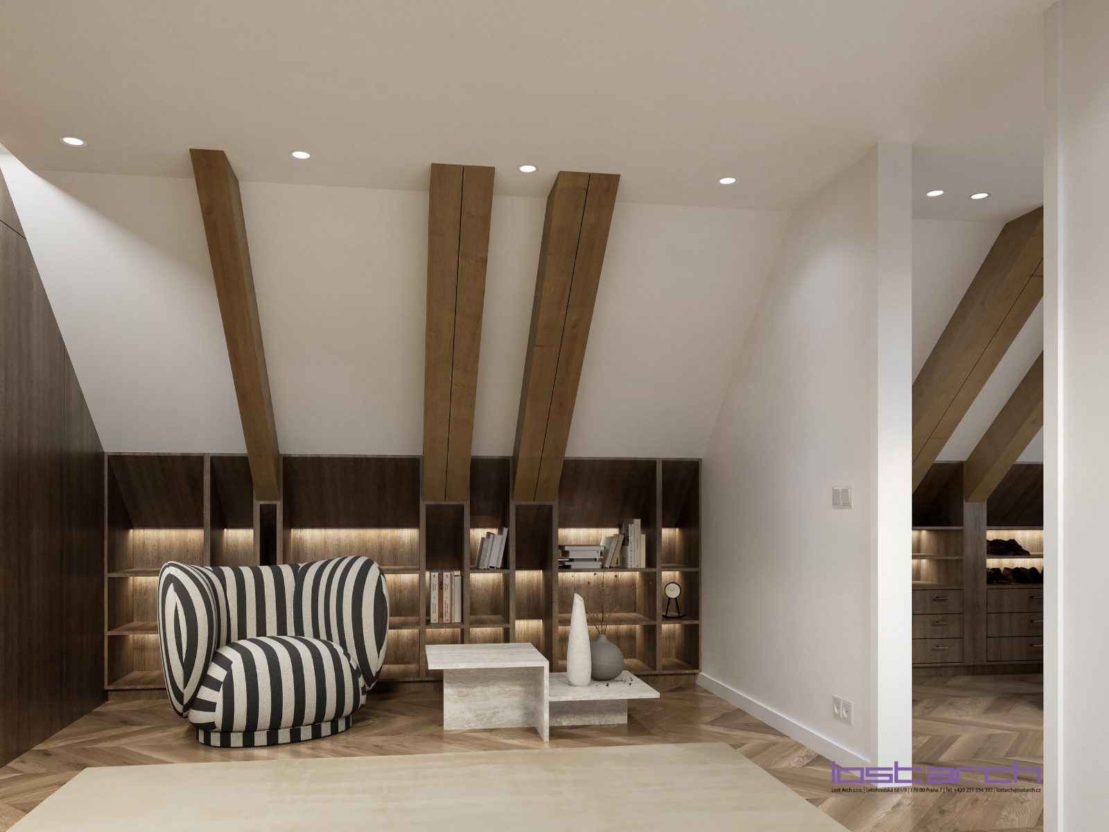 It is a spacious duplex with 3 bedrooms, 2 bathrooms, walk-in closets, a utility room for a washing machine, and a large living room with kitchen. From the living area there is direct access to the terrace with an awning. A beautiful view of Prague Castle can be enjoyed from most interior and exterior spaces of the apartment – thanks to the fact that the building is the tallest in the surrounding area, the view is completely unobstructed. The atmosphere is further enhanced by a solid-fuel fireplace. The apartment is equipped with air conditioning with heat recovery and electronic blinds.