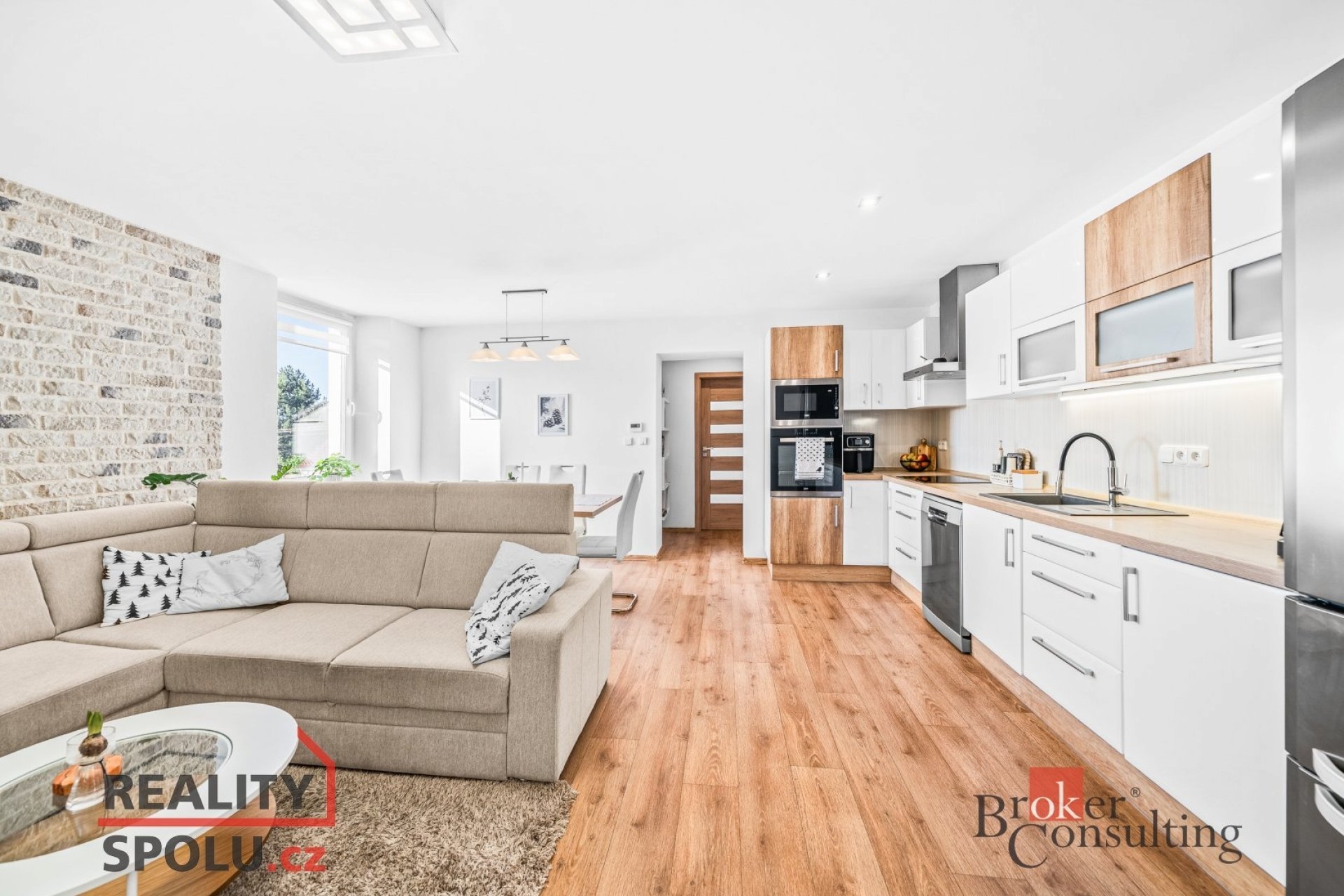 Čistý moderní interiér ... Kuchyňská linka na míru. Koupelna s vanou a samostatná toaleta. Trojvrstvá okna se stínícími žaluziemi.