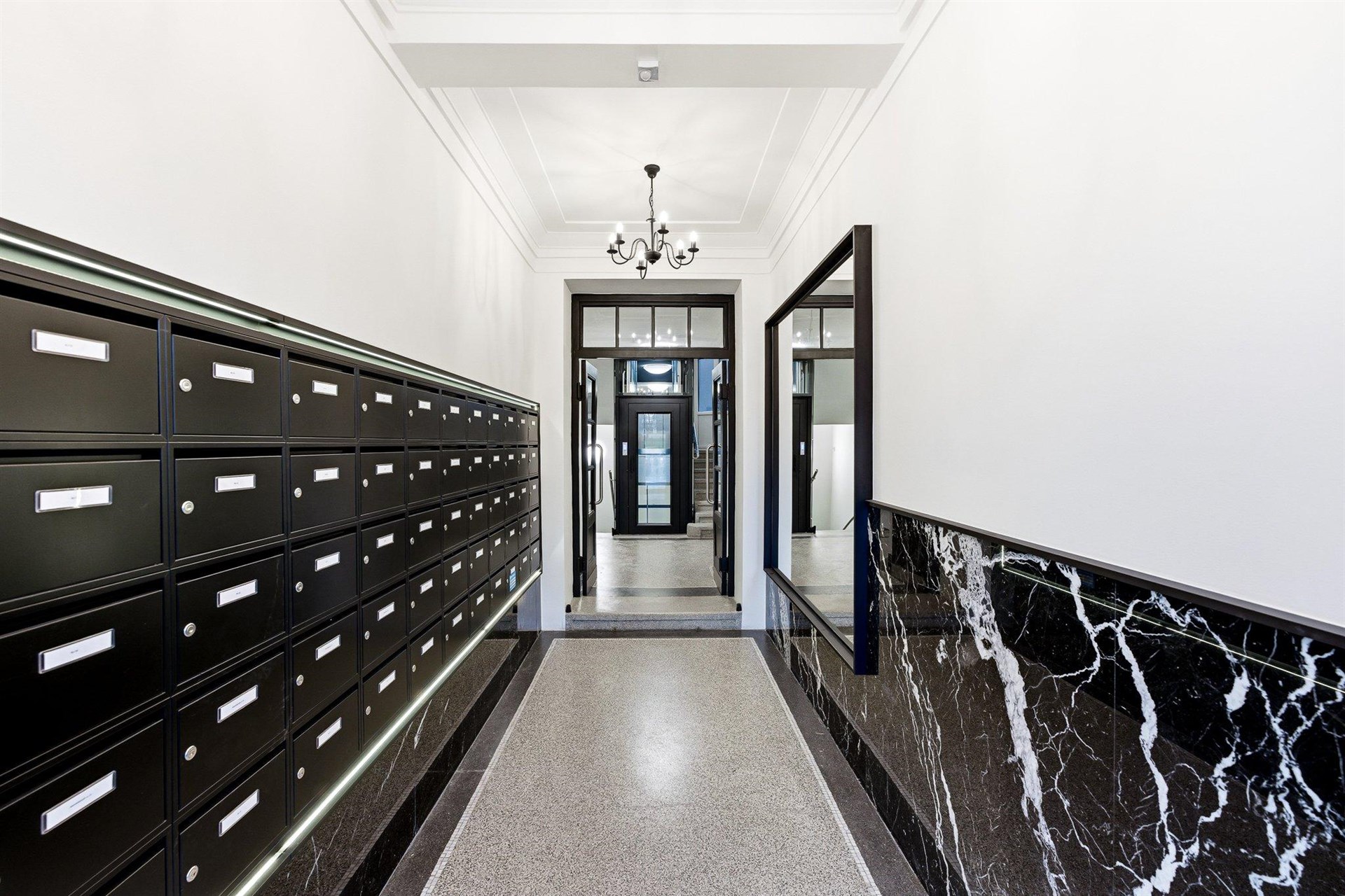 - Marble tiles in the common areas, designer lighting made of cut glass, new glass elevator, mailboxes and security doors made of oak wood
